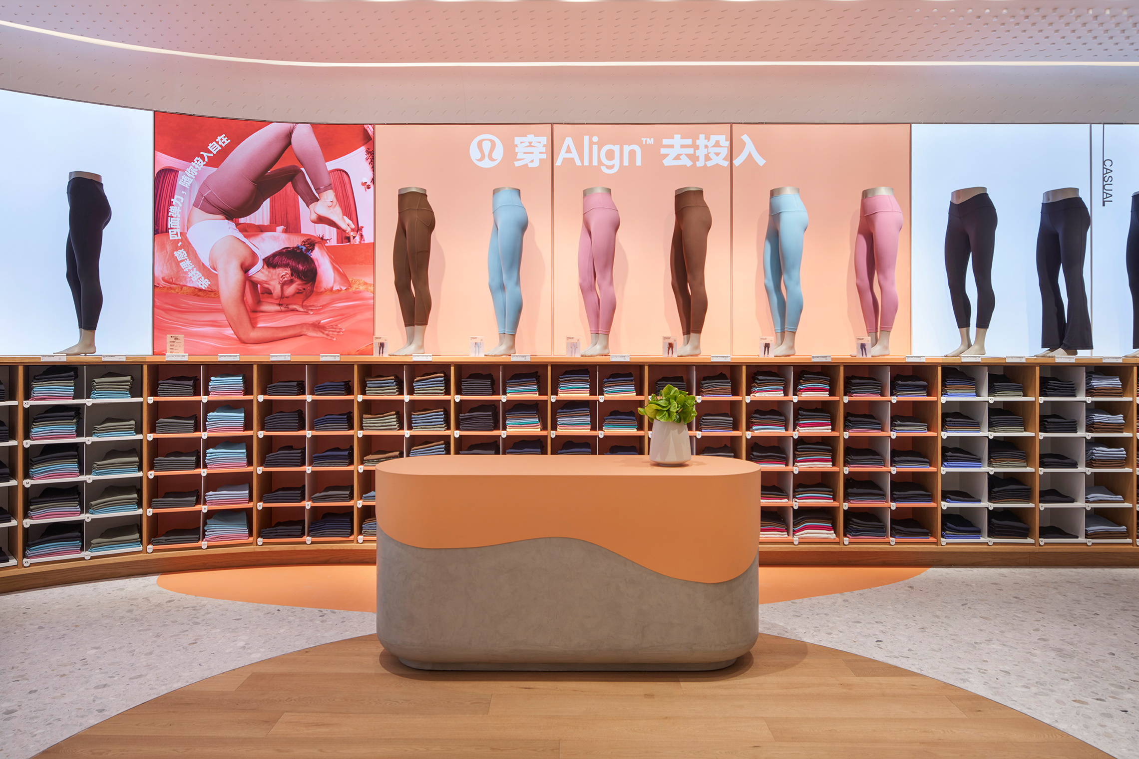 经典Align™ 裤墙位于门店2楼,呈现了各种长度、版型及颜色的Align™ 运动紧身裤。