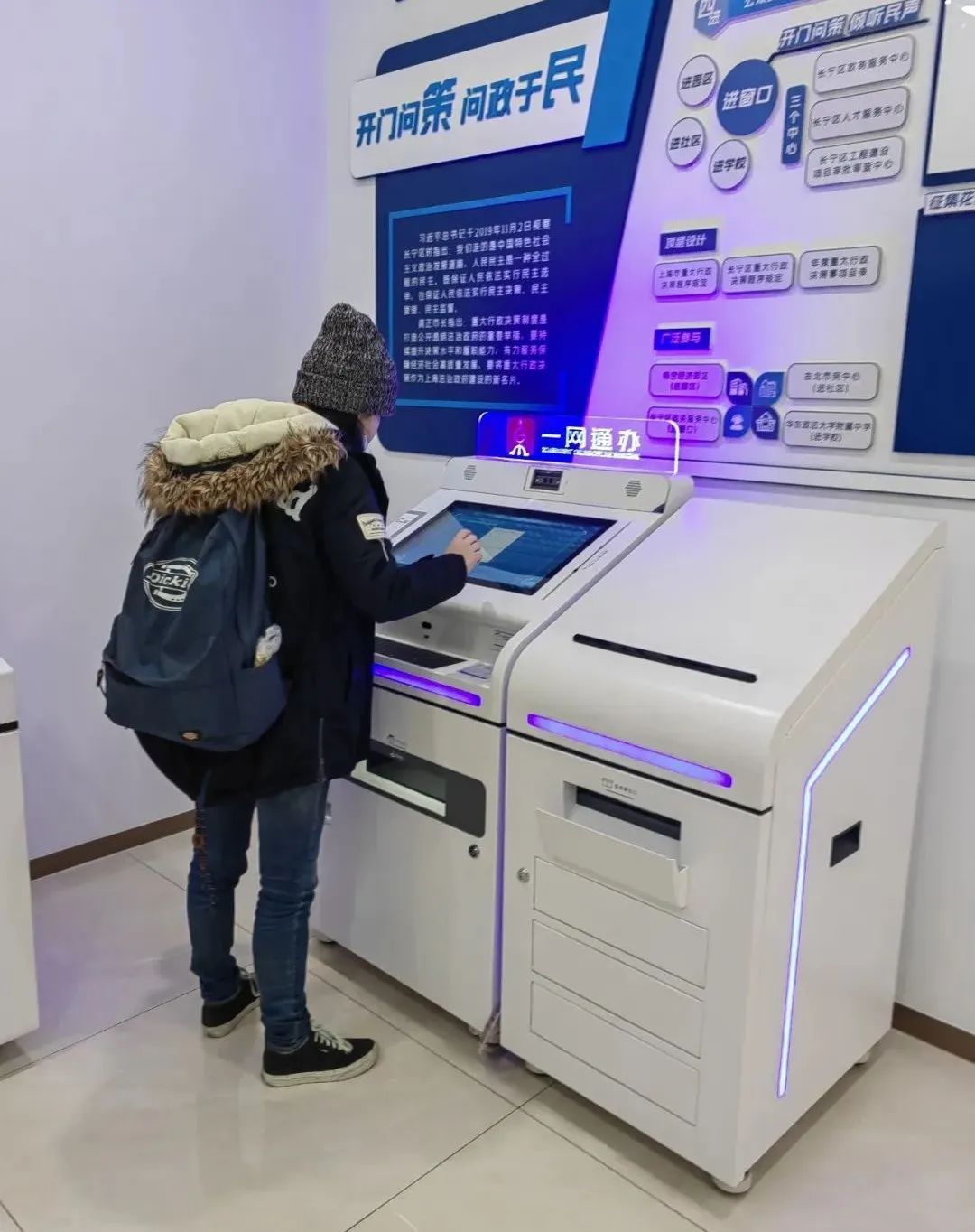 “一网通办”24小时智能自助服务区位于原老船坞一楼沿街,毗邻长宁区政务服务中心,人流密集,市民仅需刷身份证或“随申码”即可进入。