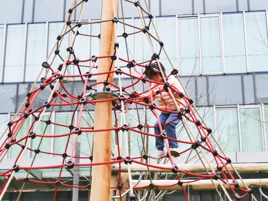 记者在现场看到,综合游乐区配有两大无动力设施。位于“C位”的勇者攀爬架,外形轮廓形似一座小山,依据人体工程学打造,可同时容纳多人。据介绍,该设施的攀面使用大网格设计,下端攀网具有弹跳性,便于攀爬穿梭,可锻炼攀爬者的上肢力量和平衡感。