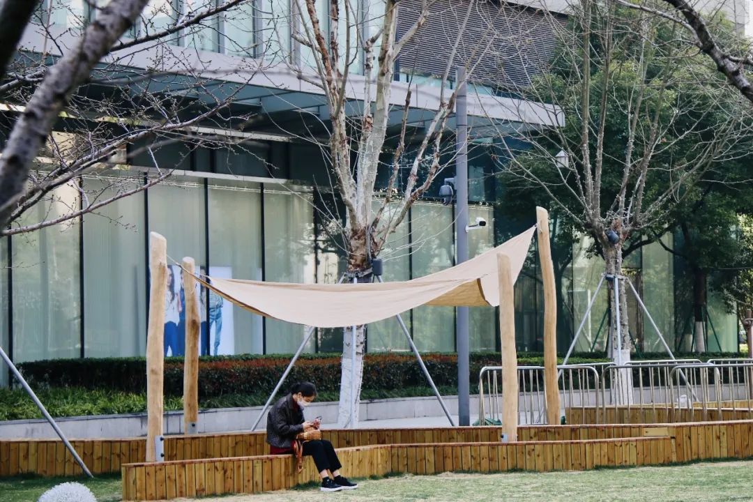 草坪派对区,视野开阔,现已配置休憩座椅和遮阳棚。作为难得的都市休闲空间,市民可在此露营野餐和户外运动。
