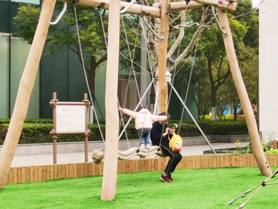 一旁的“腾云大秋千”是一个多人共享的大秋千,可同时容纳约8人。设施选用ROBINIA刺槐木材作为支柱、KOMPAN特制的“大力士”绳索作为荡绳,为游乐安全“保驾护航”。