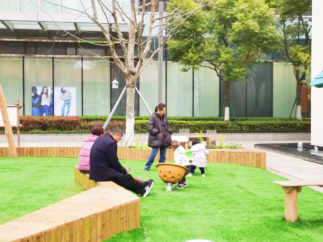 低龄游乐区内,内有多个适龄游戏设施。如游戏台,使用开放型桌面设计,设有多种细小活动部件,孩子能边玩边学,提升手眼和认知协调力;两个单人旋转碗,可360度旋转,兼具趣味性和舒适感;跷跷板高度适宜,造型萌趣,孩子们可互动并沟通交流。区域内,木质座凳随处可见,让“遛娃”家长们也能舒适休憩。