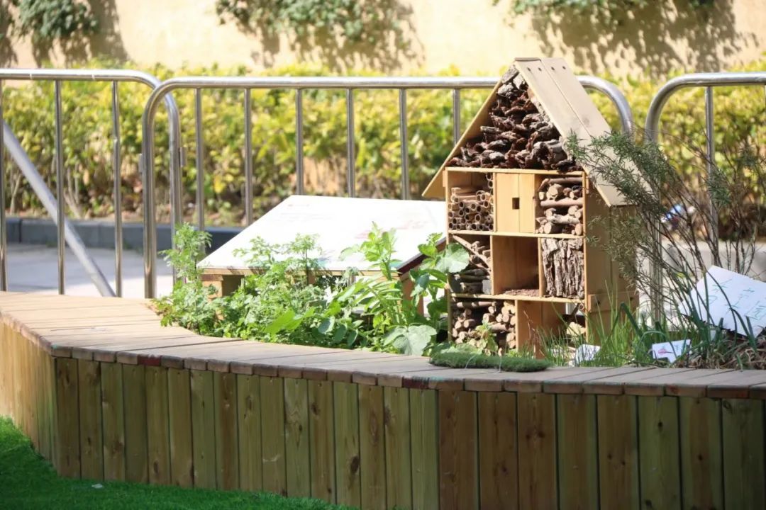 值得一提的是,长宁来福士还在乐园周边营造了小而美的小花园。正值春日,迷迭香、油菜花等绿植蓬勃生长。花园内特别设置堆肥箱、蚯蚓塔等配套设施,增添了乐园的科普性。