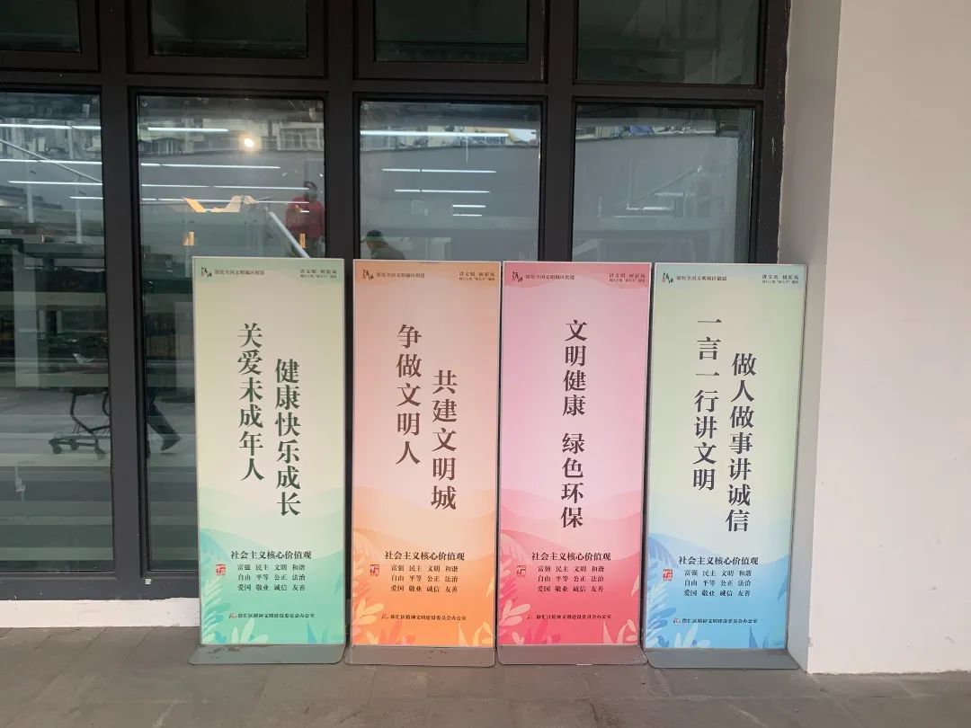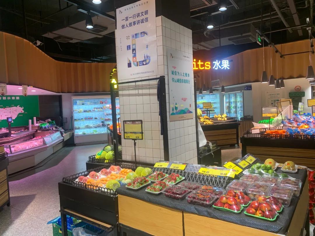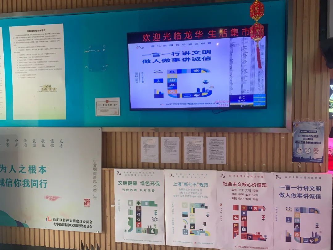 不论是在热闹的传统老菜场,还是在精致的生鲜超市里,记者发现文明标语遍布菜场内外每个角落、每个墙柱,营造出文明无处不在的浓厚氛围。清美鲜家和荟选生鲜的透明玻璃大门上,还朝内贴着给采购居民看的文明标语。龙华生活集市墙上实时滚动的电子屏,右侧滚动显示菜价,处处彰显着标准化和智能化。
