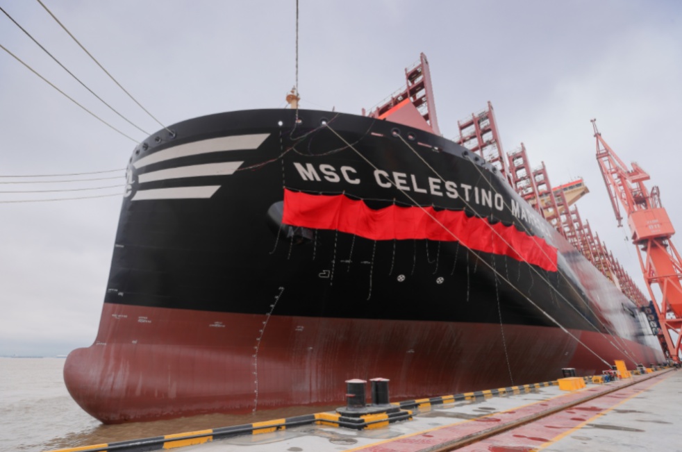 近日,中国船舶集团有限公司旗下沪东中华造船(集团)有限公司联合中国船舶工业贸易有限公司,为交银金融租赁有限责任公司和瑞士地中海航运公司(MSC)建造的24116TEU超大型集装箱船系列2号船“地中海塞莱斯蒂诺马雷斯卡”(MSC CELESTINO MARESCA)号,在中船长兴造船基地命名交付。