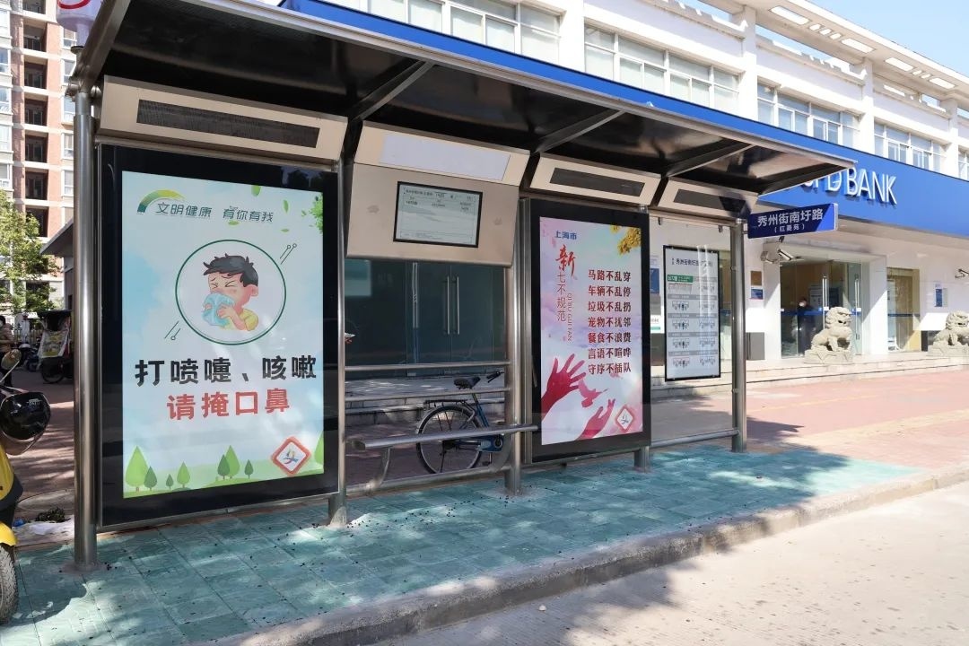 为了进一步改善乘客候车环境,朱泾镇经过前期排摸,对有基础设施条件的沿线公交站点增设了候车亭,新建的候车亭整体材质以不锈钢为主,外观简约大气,顶棚可遮阳防雨,钢化玻璃面板高清美观,配以传递正能量的公益广告更成为了展现文明风尚的一道亮丽风景。候车亭内最为醒目的是电子显示屏,屏幕上除了有本站信息、当天日期、时间、天气、温度等便民信息外,还显示途经本站点的线路开往目的地和预计到站时间。这些信息都是由公交车车载GPS实时将车辆运行情况上传至公交公司数据中心,后台集调系统通过数据分析,预测出途经站点的公交车行车进程、到达本站时间等信息,并同步显示在站台屏幕上。