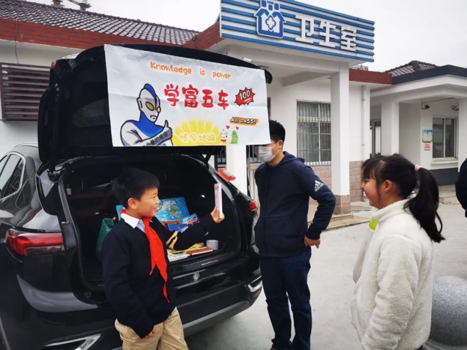 家住附近小区的康宁,专门带着小学三年级的儿子开车过来参与后备箱二手书市。父子两人设计制作了横幅,为自己的书市取名“学富五车——博学地摊”,还在后备箱挂上了彩灯。“我们参加了很多次这样的书市,很喜欢这样的活动,让闲置的书籍流动起来,传递知识,还很环保。”