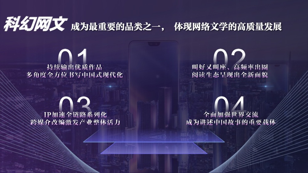 在中国社会科学院发布的《2021中国网络文学发展研究报告》中,提到科幻题材已成为网络文学的五大品类之一。而本次白皮书认为,“十四五”规划实施以来,在国家、社会和平台等各方的引导和扶持下,中国网络文学形成了题材多样化、类型多元化的内容格局,在书写“中国故事、中国经验、中国想象”的过程中扮演着愈发重要的角色。作为当下最重要的一种网文品类,科幻网络文学展现出“中国式现代化故事”未来叙事的无限可能。