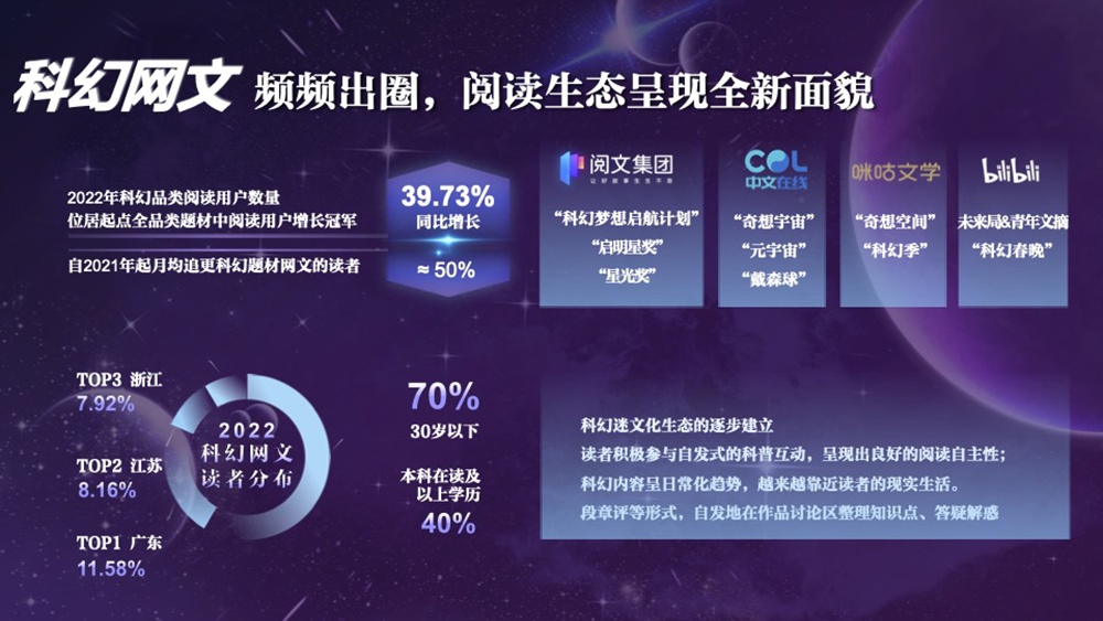 在读者生态方面,白皮书指出科幻网文正在成为最受读者欢迎的一种网文品类。以起点为例,自2021年起,月均有近半数的读者追更科幻题材网文,2022年科幻品类阅读用户数量相较去年同比增长39.73%,位居起点全品类题材中阅读用户增长首位。同时2022年近70%的科幻品类阅读用户年龄在30岁以下,40%左右为本科及以上学历,30%左右分布在广东、江苏、浙江等沿海经济发达地区。这些消费能力强的读者也有着更强的付费意愿,2022年,起点科幻品类的付费用户规模相较去年同比增长近118%,付费阅读转化比高达25%,均为起点全品类网文题材的第一名。