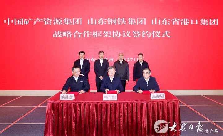 3月27日下午,中国矿产资源集团与山东钢铁集团、山东省港口集团战略合作框架协议签约仪式在山东大厦举行。省委书记林武,中国矿产资源集团董事长姚林、总经理郭斌出席。
