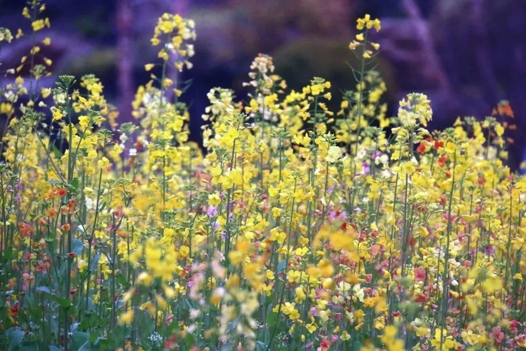 区别于普通作物型油菜花,彩色油菜花有鲑鱼色、浅粉色等多种花色,花期为每年3月,黄色的油菜花中点缀着朵朵菜花,仿佛一幅充满质感的油画。