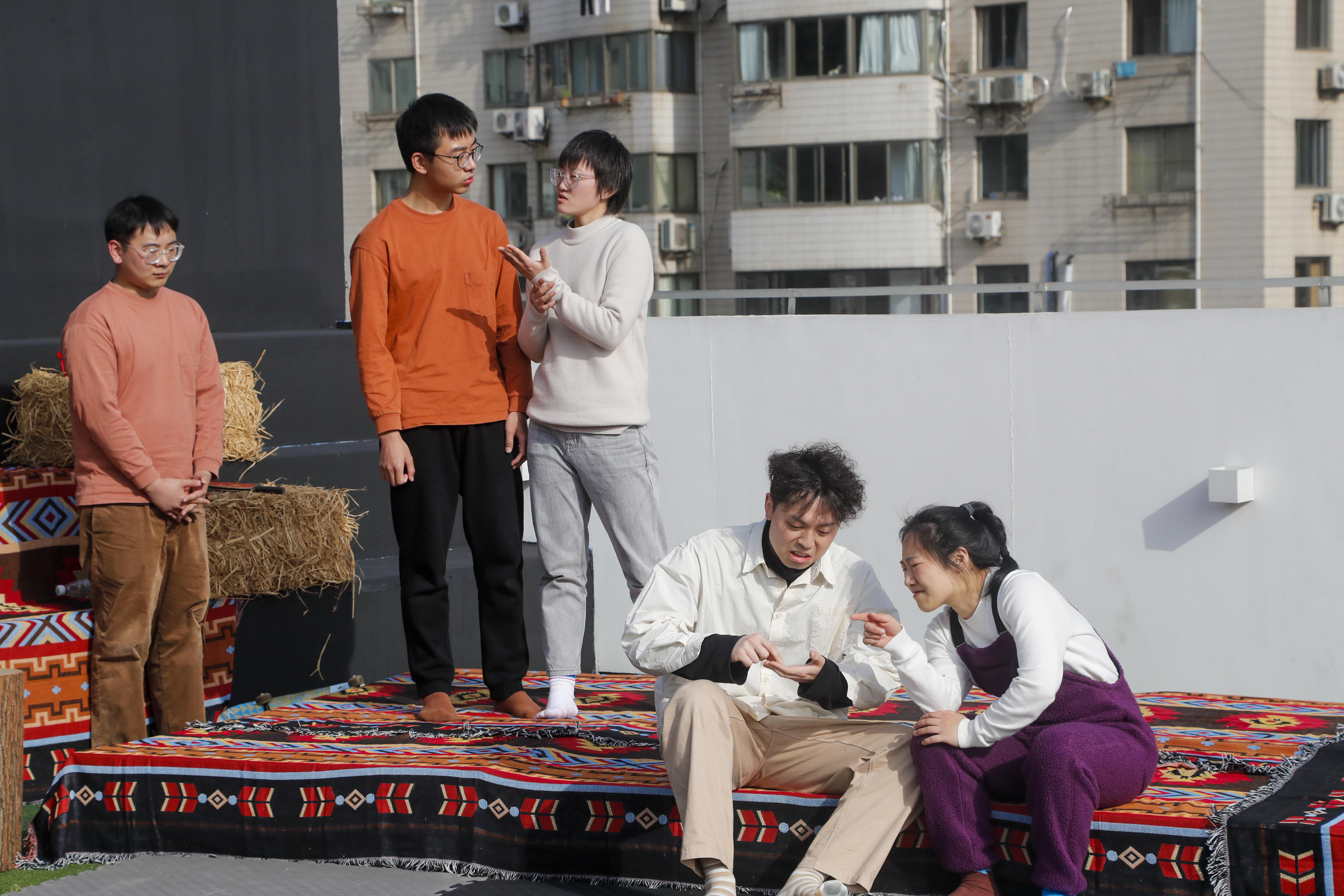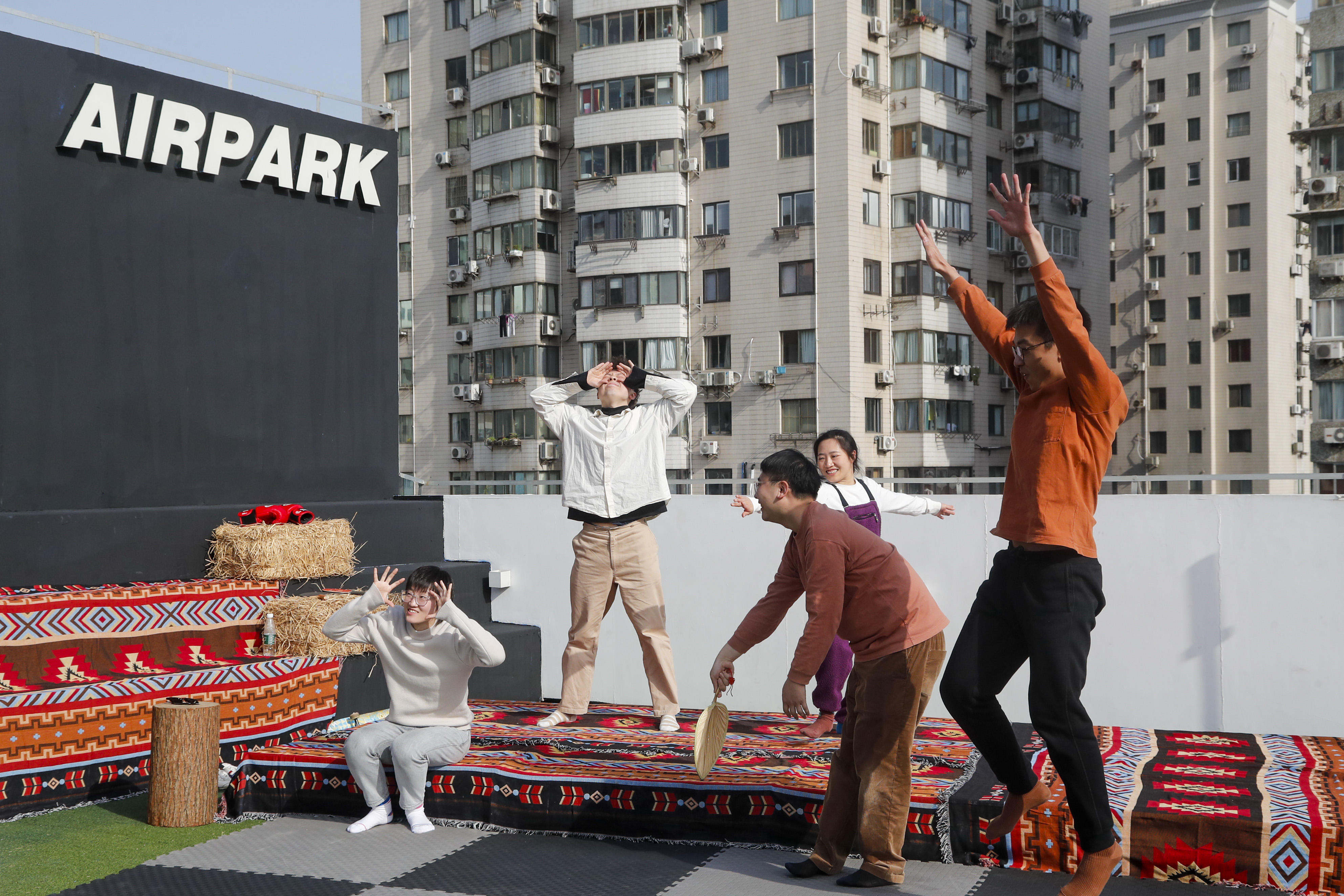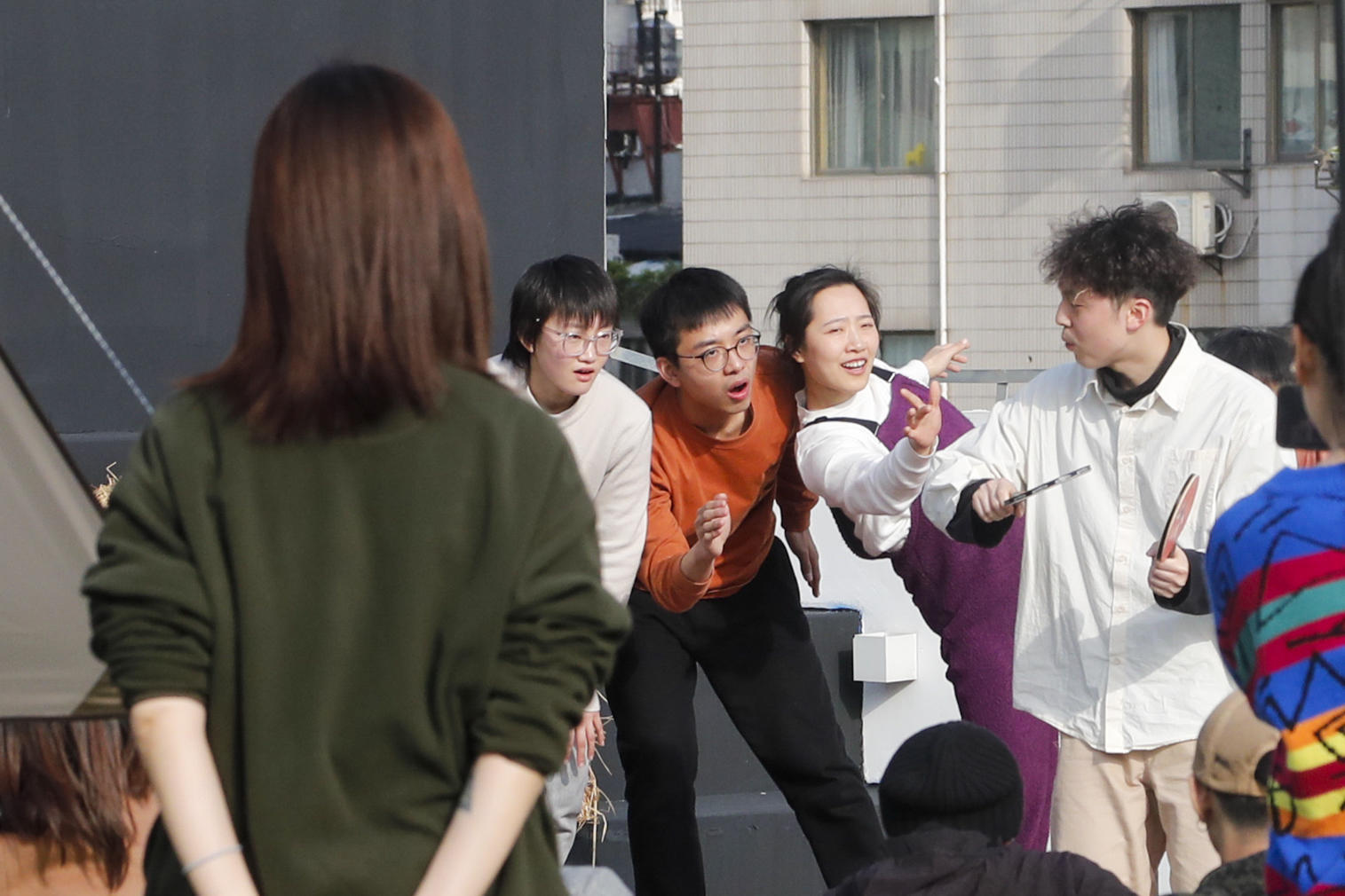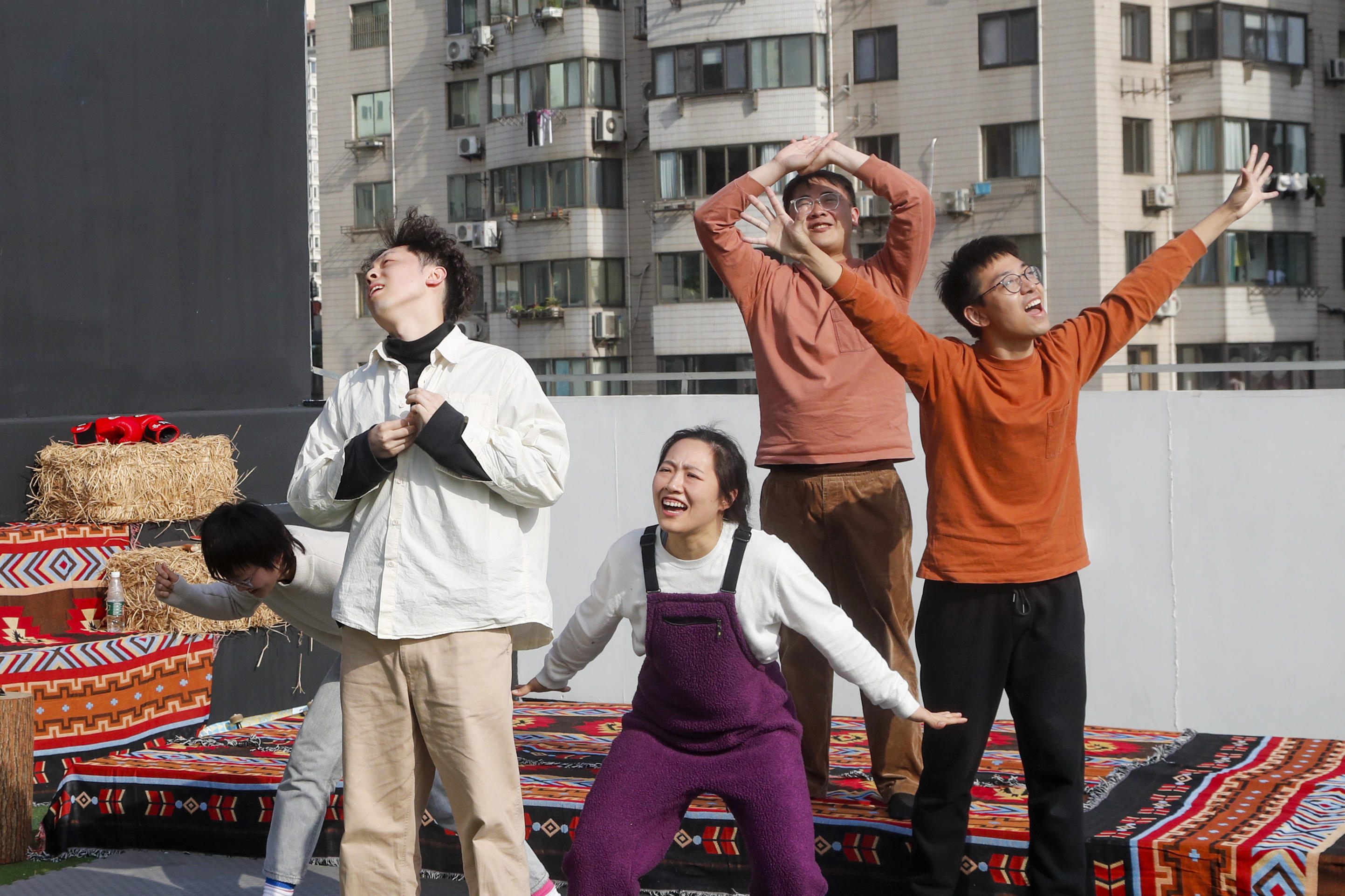 即兴话剧虽然是个表演项目,可是在即兴舞台上,往往是没有主角的,因为戏剧的推进讲究配合,还原剧团是一支成立5年多的即兴话剧团,目前有10位团员,成员中有专业的戏剧从业者,也有来自幼师、科技等行业,大家因为喜爱,坚持兼职做着剧团。“这是剧团第一次在屋顶演出,屋顶的光、声音都和封闭的空间都完全不一样,以前我们也经常在室内舞台里做眺望远方的动作,而这一次我们眼神的聚焦终于不用落在墙壁上,可以真的和天空、云和落日互动。”还原剧团团员汤宇泽在演出中,就地取材,将所有可以利用的健身器材都拿来做道具,“比如药球,用来寓意工作的负担就很有表现力。”