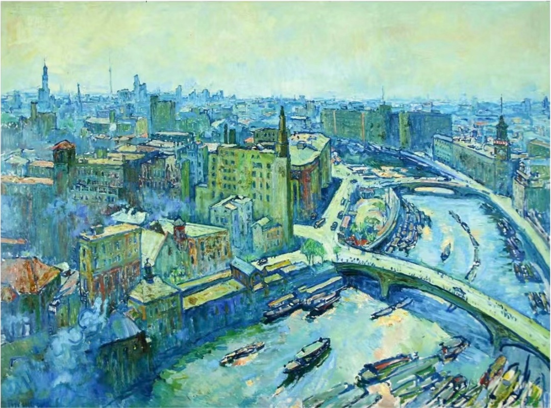 1978年,陈钧德在外滩上海大厦11楼,创作了两幅尺幅较大的油画《上海的早晨》。这是他早期的油画代表作。作品运用小号笔,像莫奈那样细腻地敷色,描绘改革开放初期百废待兴的迷人上海。