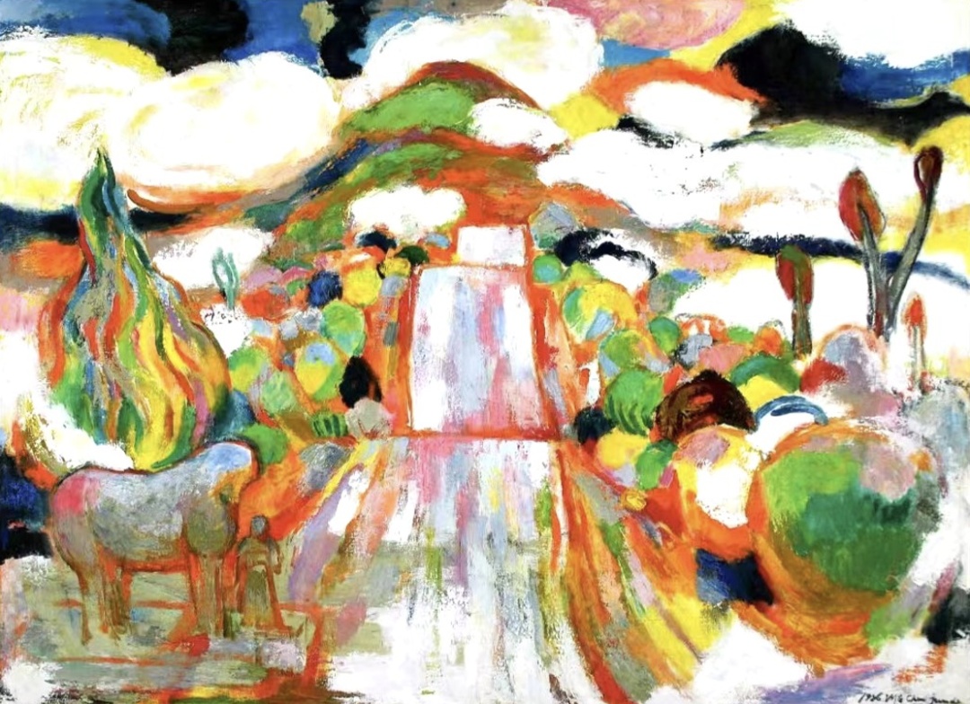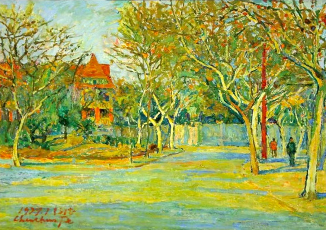 1980年代,在改革的春风吹拂中,陈钧德的“绘画革命”高歌猛进。他以金属般明亮的表现主义绘画,在全国性油画大展中备受关注。请留意这幅创作于1986年的作品,陈钧德大胆创新,将道路两边的树冠概括为一个个球状,将天上漂浮的朵朵云彩概括为椭圆。整幅画一改传统陵墓的阴郁之气。