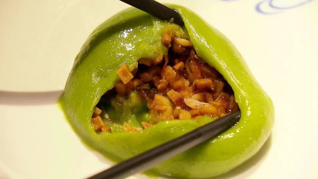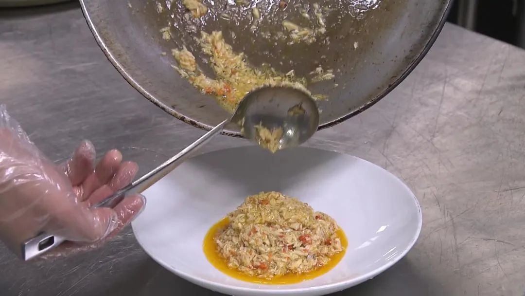 商场的另一家创意蟹宴餐厅同样也带来了属于春天的“鲜味”。餐厅后厨内,大厨下入蟹油、猪油,再倒入刚刚拆好的蟹粉,不一会儿,喷香的炒蟹粉就可以出锅了。再将放凉的蟹粉混合猪肉馅,一个个散发着丝丝蟹香的青团就在点心师傅的手中诞生。