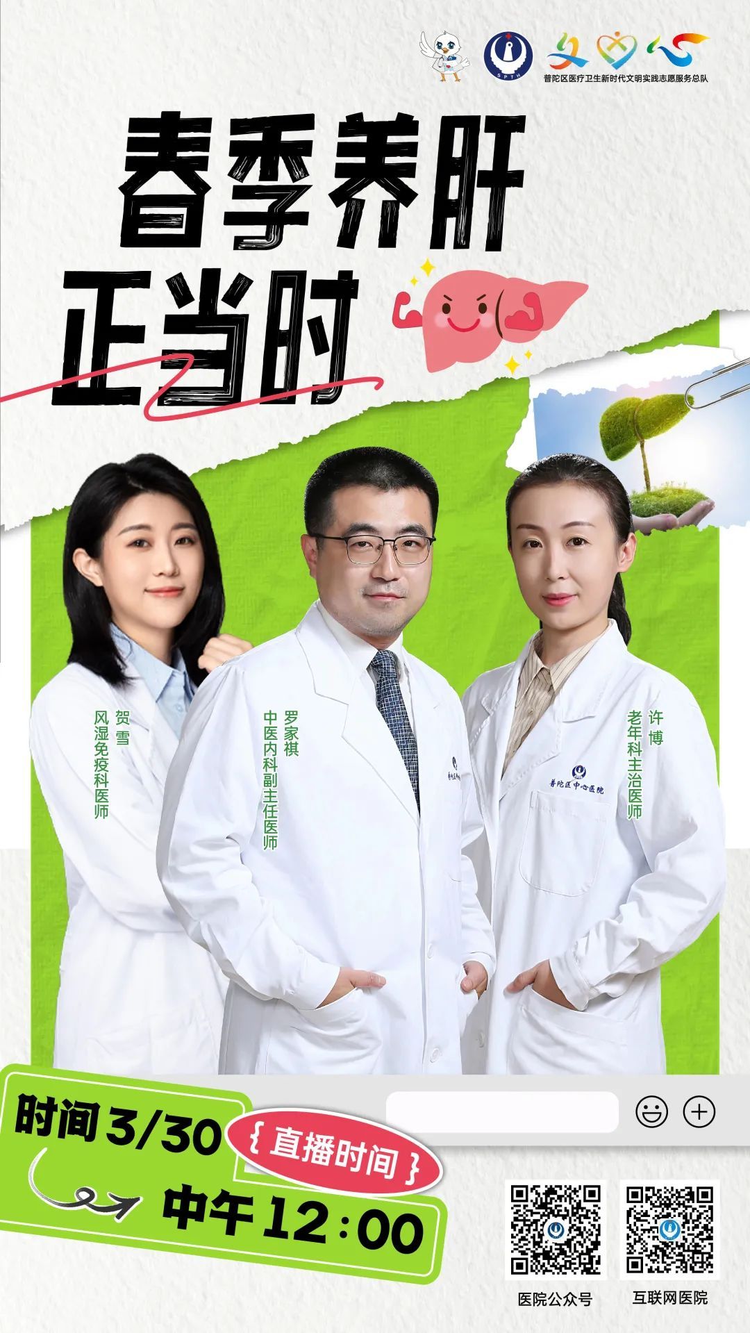3月30日(周四)12:00,普陀区中心医院5G健康直播间将以《春季养肝正当时》为主题,由中医内科副主任医师罗家祺、老年科主治医师许博、风湿免疫科医师贺雪一起搭档,一起了解春季护肝养肝的中医小秘诀,为健康体魄打好基础。观众朋友们,让我们不见不散~