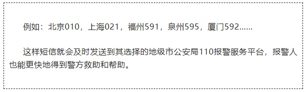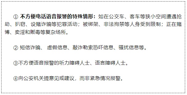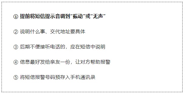 “中国警方在线”近日发布提醒:遇到陷入传销窝点、入室盗窃抢劫、聋哑人报警等不方便打电话的情况时,都可以简明扼要描述正在遭受的侵害,是否方便接听警方电话,然后迅速给12110发短信报警,警方会第一时间处置报警,将你救出险境。