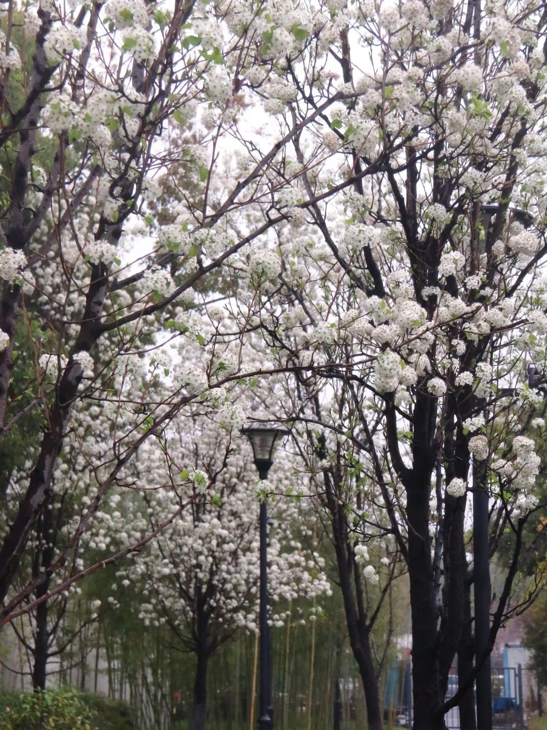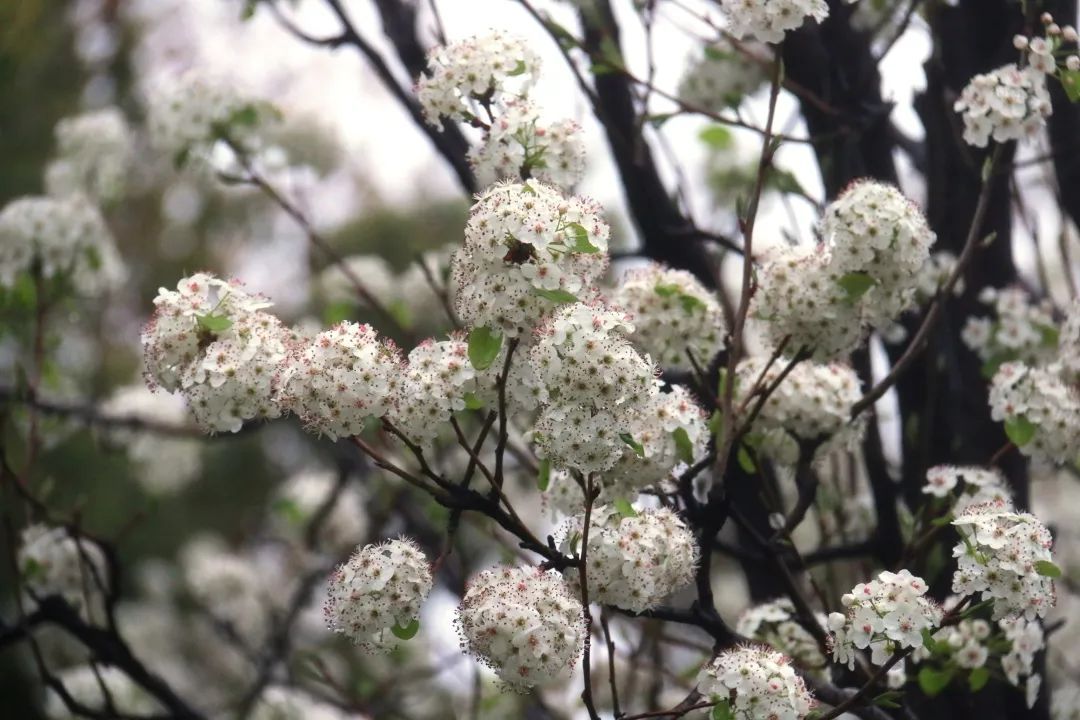 豆梨样式别致,在园内养护团队的悉心栽培下,今年的豆梨同样长势喜人,花量大,花色白净如雪,不输樱花梅花。