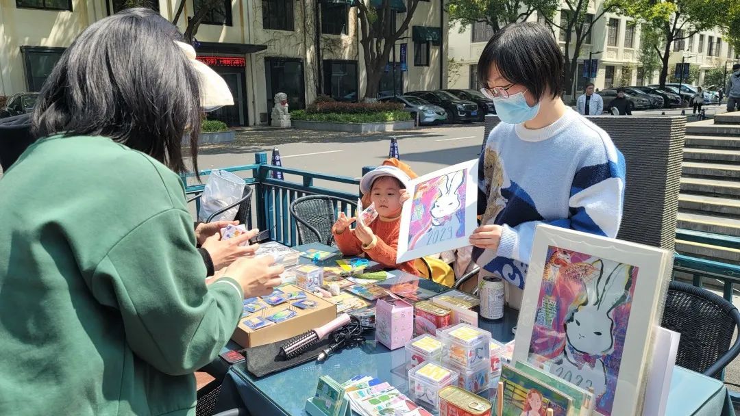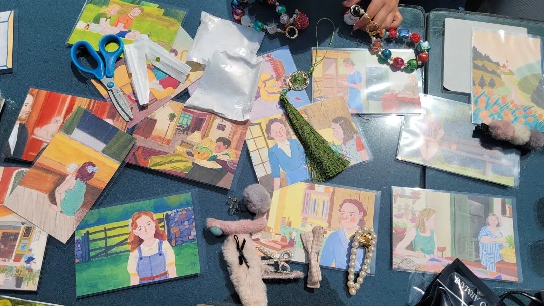 除了二手闲置,还有不少白领是把自己平时创作的手工艺品拿到了集市现场售卖。在众多摊位中,一位短发小姐姐的摊位前挤满了年轻漂亮的女孩子。她在售卖的是自己亲手绘制的明信片、插画、魔方,看得人不自觉地发出赞叹,“画得真好!”“太有才了!”