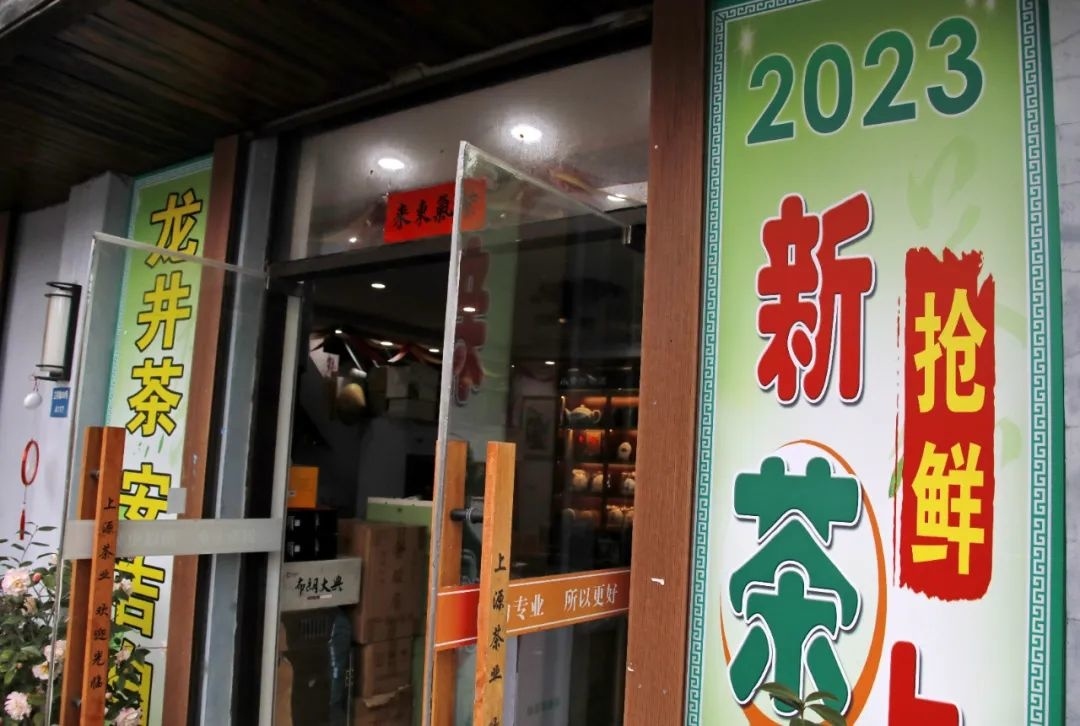 近日,记者在金山区的一处茶城看到,不少经营春茶的商户都在店铺前摆出了新茶上市的招牌。“明前茶”龙井被摆放在了各家店铺的显眼位置,不少听闻春茶上市的老茶客们更是寻“茶香”而来。