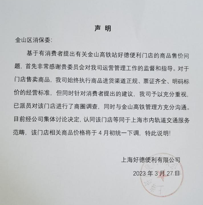 上海好德便利有限公司高度重视,立即派工作人员对门店所在商圈进行调查,并回应:金山卫站内门店原本是参照高铁服务范畴的公司定价标准,因运营成本等因素,高铁站点内门店定价普遍高于其他门店。经研究决定,该站点将参照上海市内轨道交通服务范畴管理,决定于4月初将价格下调,具体声明如下: