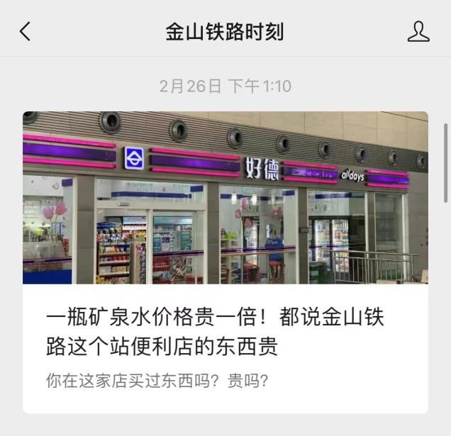 近日,“金山铁路时刻”公众号发布了一篇《一瓶矿泉水价格贵一倍!都说金山铁路这个站便利店的东西贵》的推文引起了区消保委的关注,阅读量达7800多人。原来,有市民反映金山铁路金山卫站南广场候车室内的一家好德便利店所售商品价格都偏贵,一瓶550ml的农夫山泉在市中心的好德和全家便利店均售价2元,而在金山卫站的这家便利店售价4元。