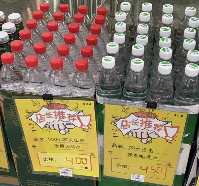 于是,区消保委选择了金山石化城区的3家好德便利店,对2款矿泉水的价格展开对比。工作人员发现这3家好德便利店内550ml的农夫山泉和555ml的怡宝售价均为2元/瓶。