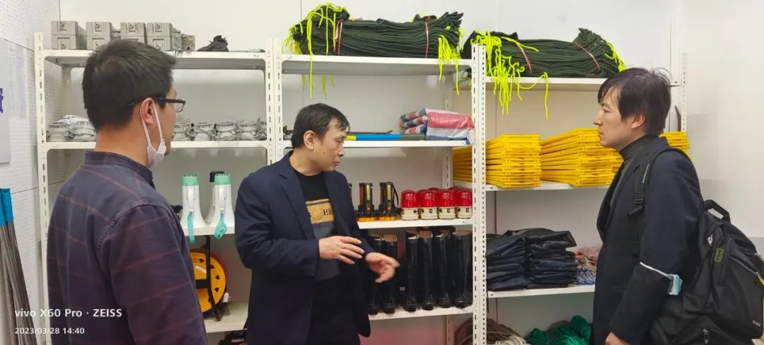 徐汇区防汛办工作人员在认真听取上海南站管委办关于今年防汛工作准备、应急力量编配、隐患排查治理、特殊情况群众转移安置等情况介绍后,实地检查了防汛物资储备点。