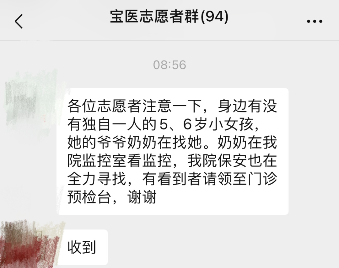 在内镜室门前维持秩序的志愿者看到一个大约5岁模样的小女孩正在东张西望,身边没有家人陪伴。她赶紧上前询问,小女孩表明自己正在寻找家人。志愿者立即将孩子带到预检处,保安将孩子奶奶从监控室叫回,在确认身份后,志愿者放心地把孩子交到老人手中。看到孩子安然无恙,老人心里的石头才算落了地,不停地向志愿者表达谢意。