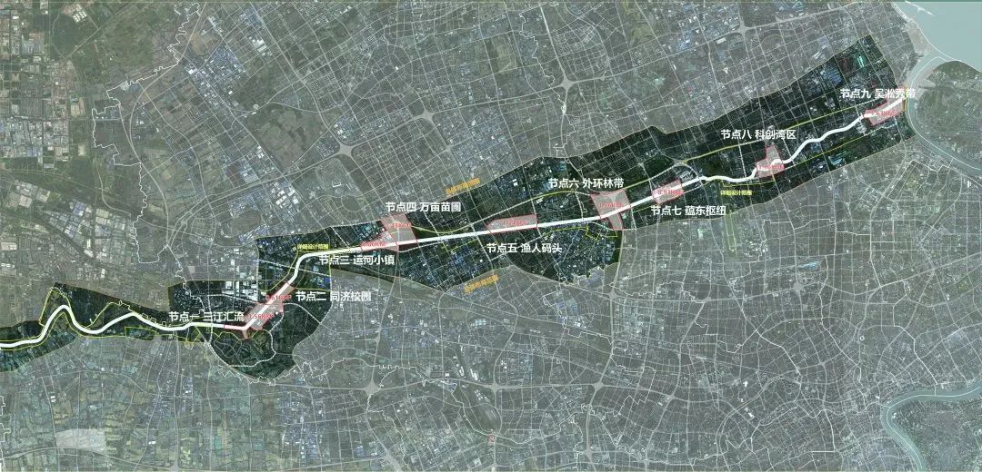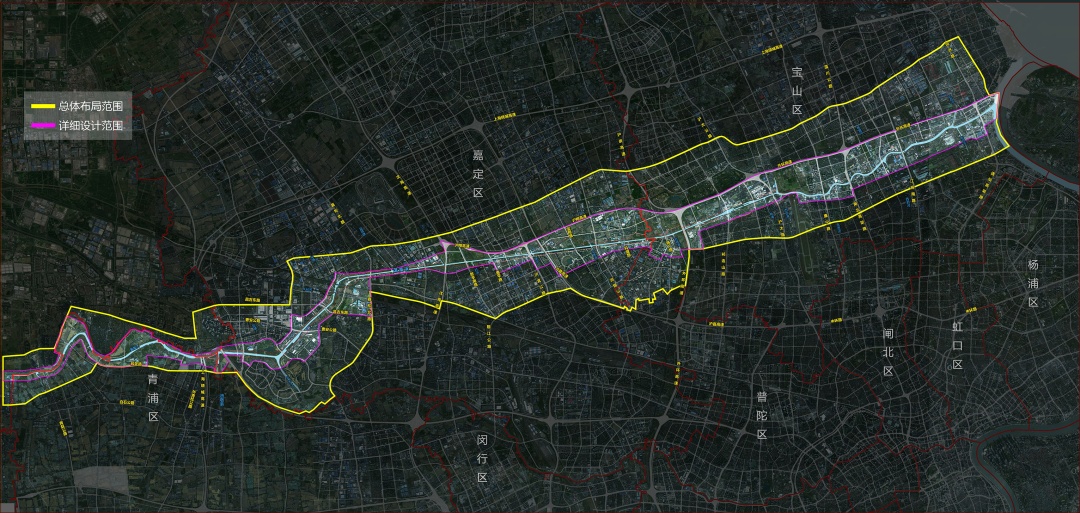节点一(三江汇流):东至宝安公路,南至安研路,西至吴淞江-苏州河蓝线外50米,北至于田南路,设计范围约1.56平方公里,研究范围约8平方公里。