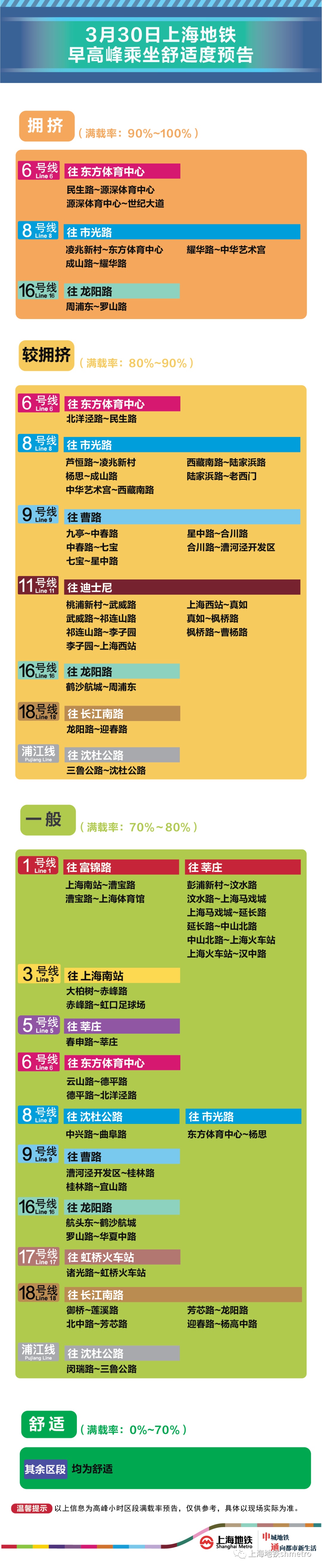 为提升上海地铁早高峰期间出行服务水平,提升乘客乘坐体验,上海地铁向乘客提供乘坐舒适度预告,方便乘客提前做好出行准备。