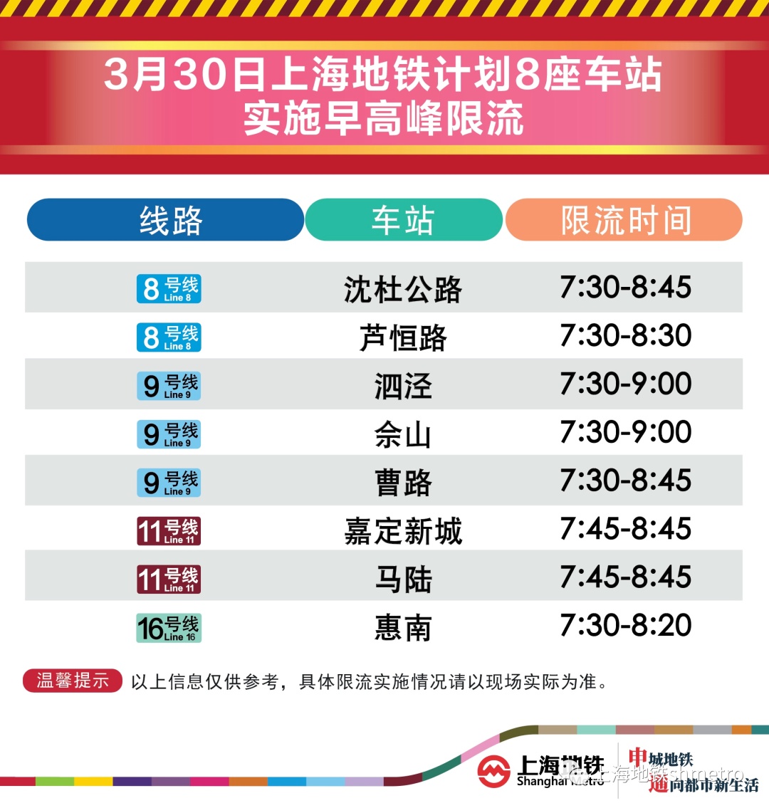 3月30日,上海地铁早高峰限流措施将继续实施,届时将有8座地铁站早高峰计划限流。