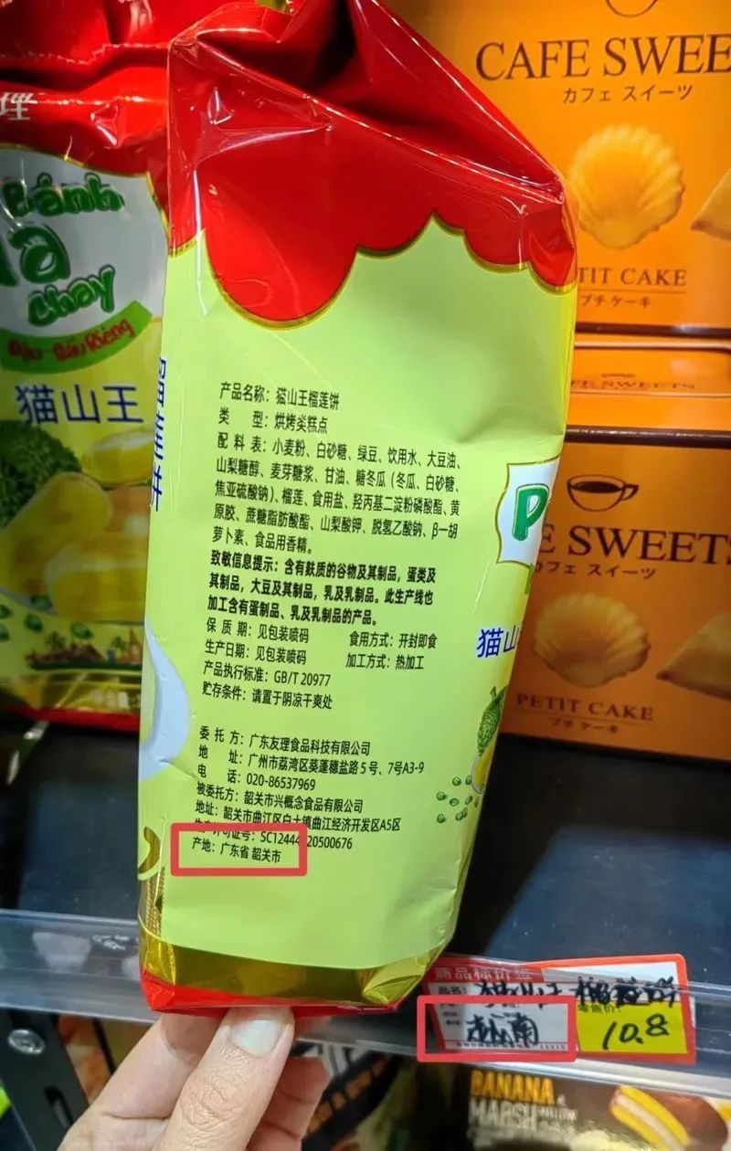 店内充斥类似的“障眼法”:标签产地为俄罗斯的“俄罗斯列巴”,实际产地为浙江嘉兴;标签产地为越南的“猫山王榴莲饼”,实际产地为广东韶关;标签产地为日本的“北海道风味奶盖蛋糕”,实际产地为福建漳州。