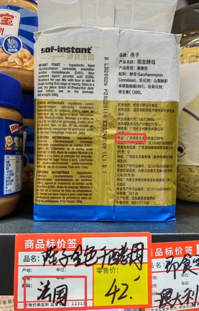 在东昌路500号的“进口食仓”(公司登记注册名为“上海市浦东新区陆家嘴街道启少食品店”)里,一款“燕子即发酵母”包装袋上标注的制造商明明在广西来宾,但商品标价签上的产地一栏却写了“法国”两个大字。