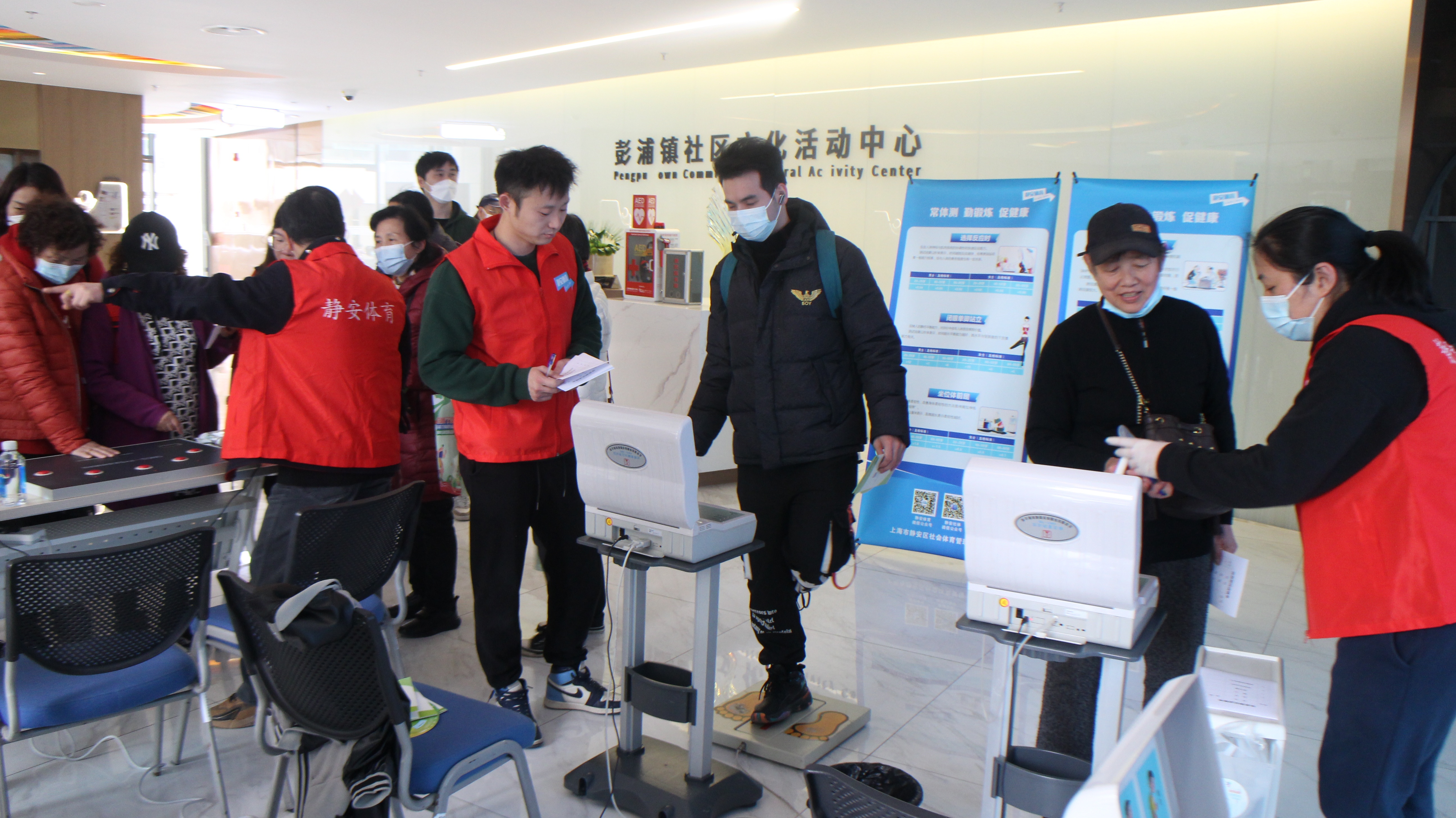 在活动主办方设立于彭浦镇社区文化活动中心广场上的“运动体验活动集市”上,来自居民区、企事业单位的男女老少,他们或参加投篮、康乐球、电动骑车等体验式健身运动,或接受握力、肺活量、血压等身体健康检测服务,或在公益小课堂里听专家讲授不同类型健身器材的使用、保养方法,整个广场呈现一派“人人共享体育,体育造福人人”的欢乐景象。