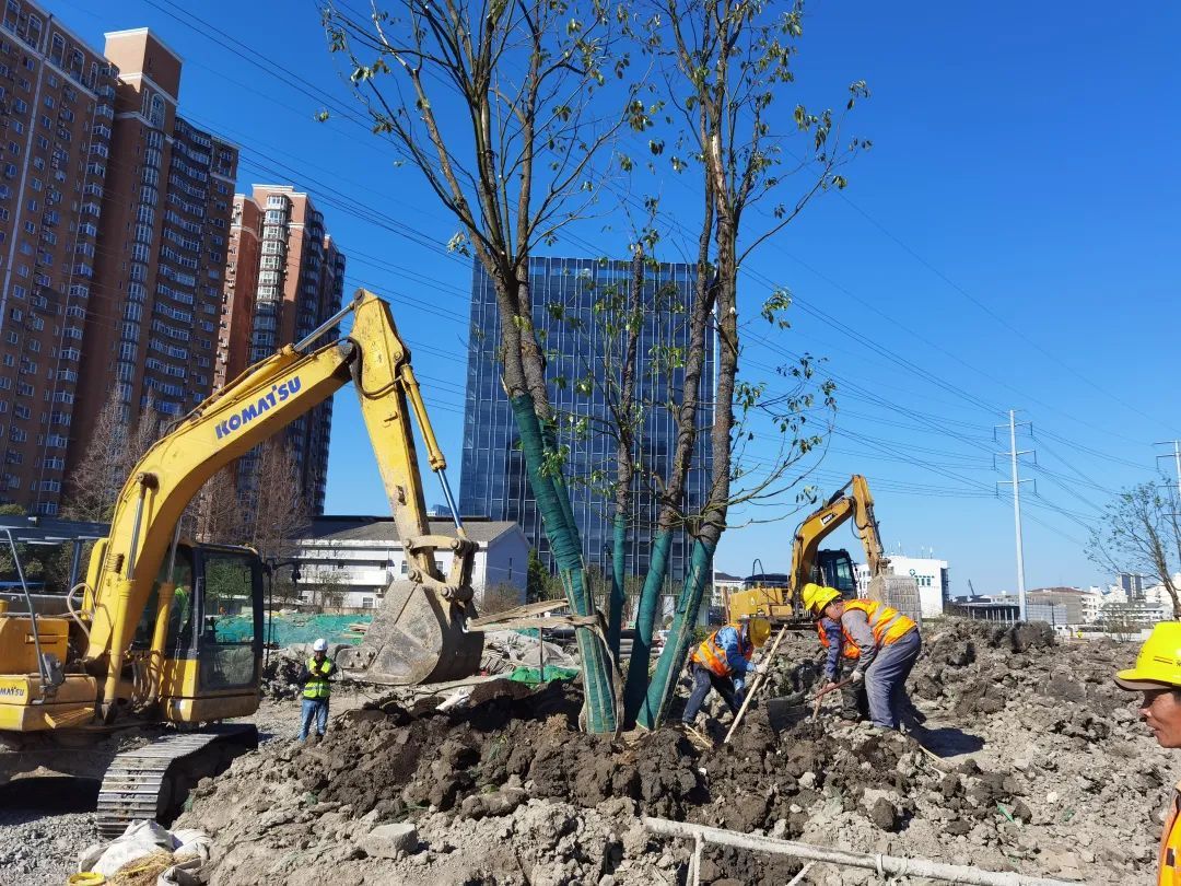 施工现场,一辆辆挖掘机正在将树苗放进指定坑位,再由工人们配合进行覆土定植。不少新栽苗木已长出青翠叶芽,在阳光下轻轻随风摇曳,散发出勃勃生机。据悉,园内计划种植桂花、樱花、三角枫等140余种苗木,确保四时皆景。