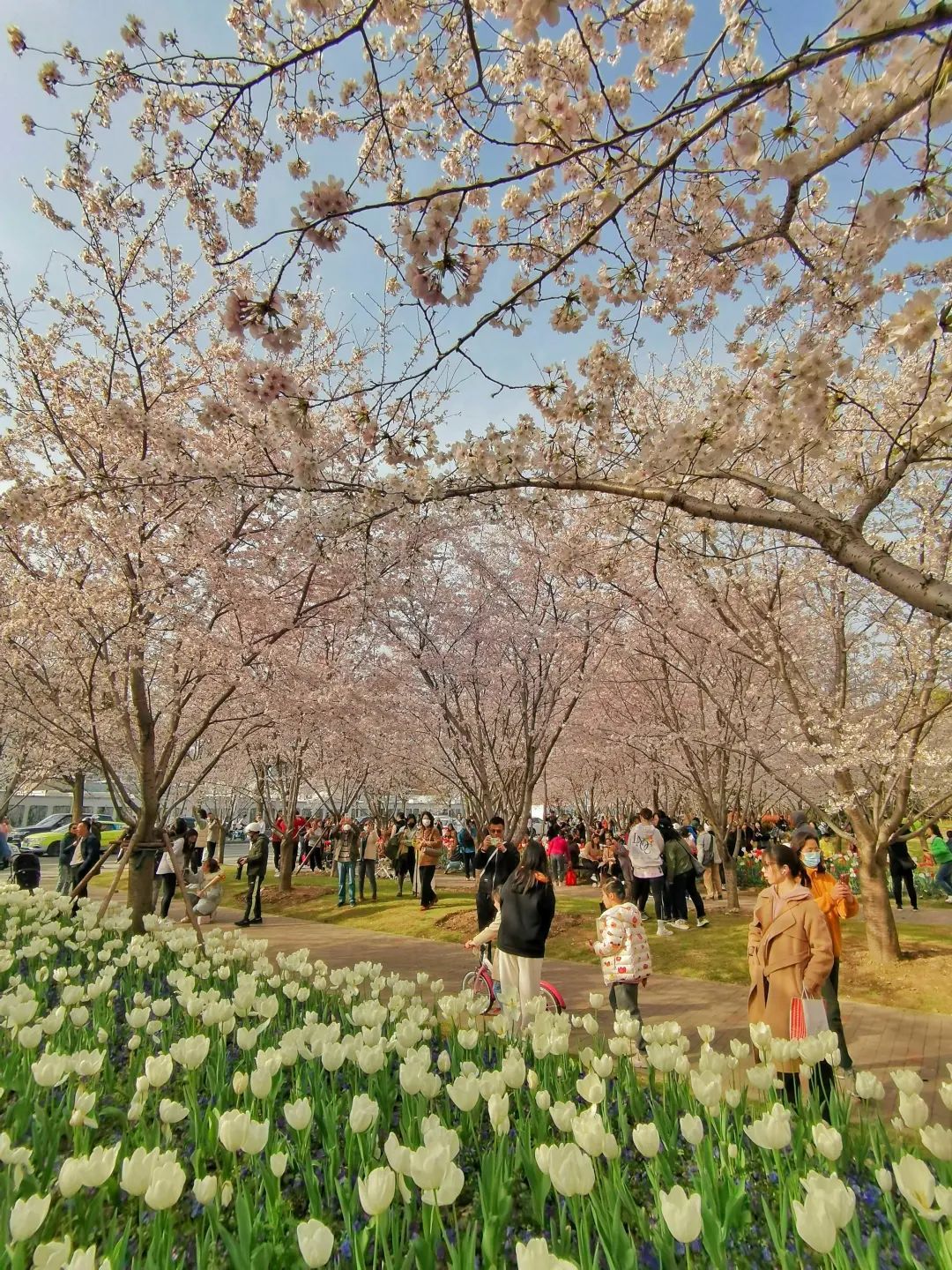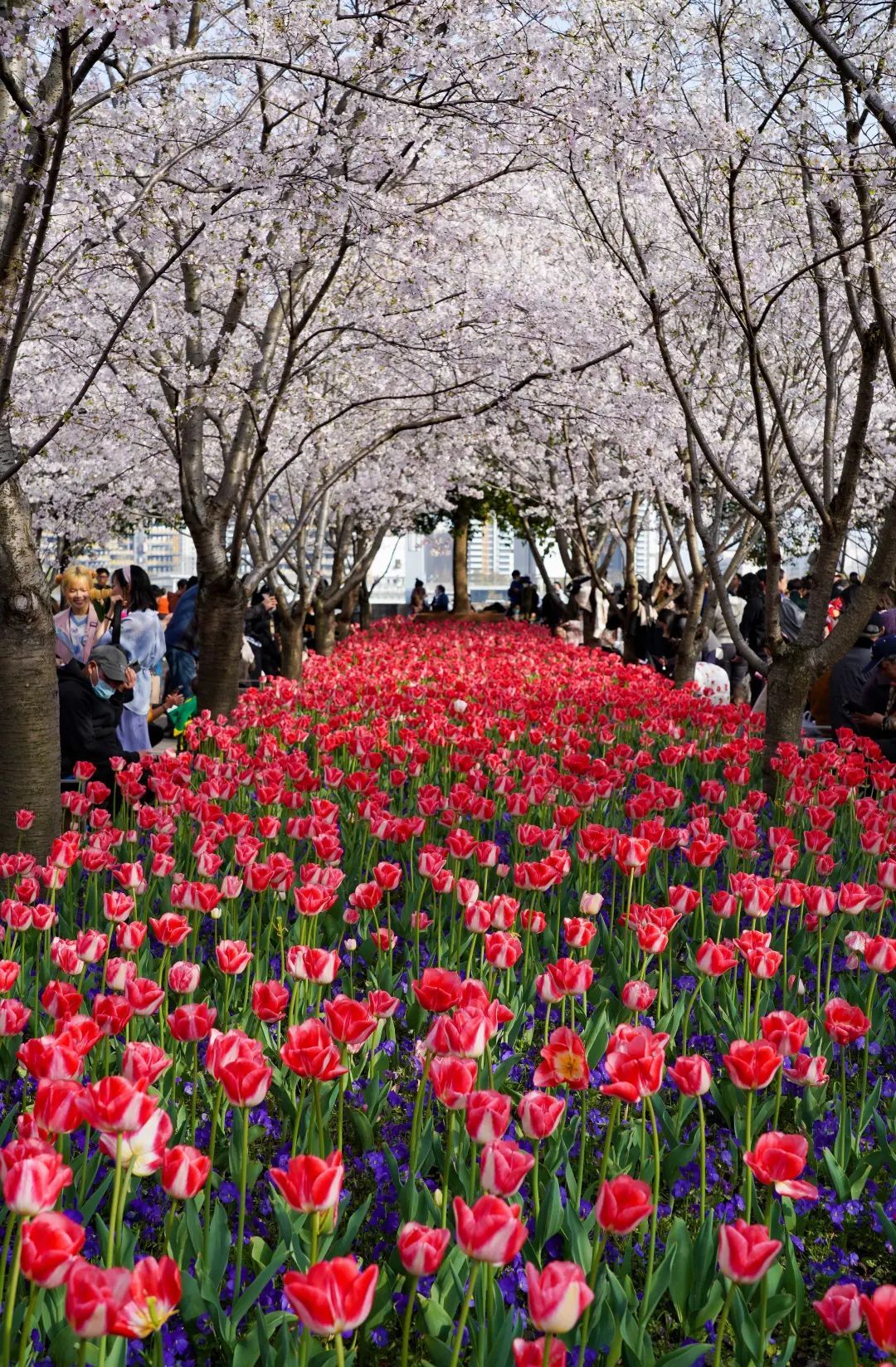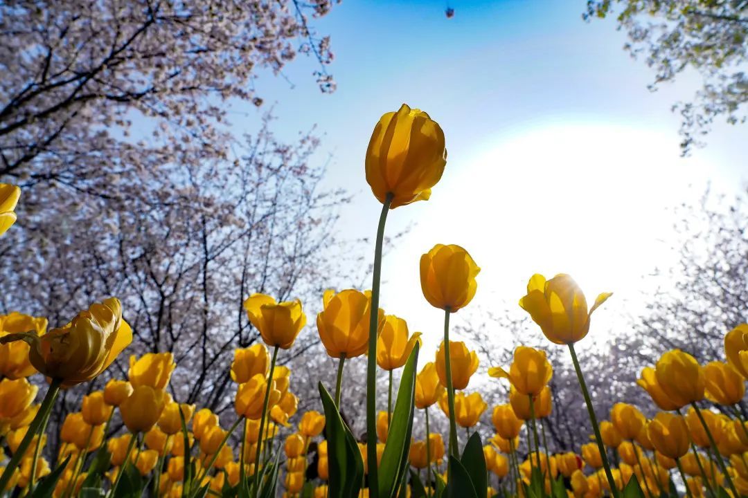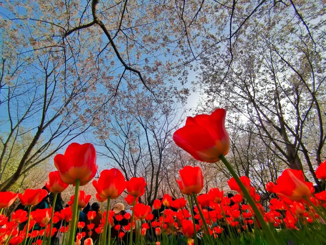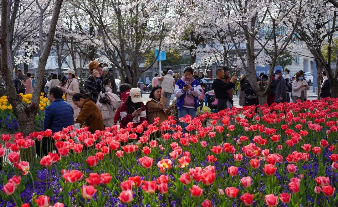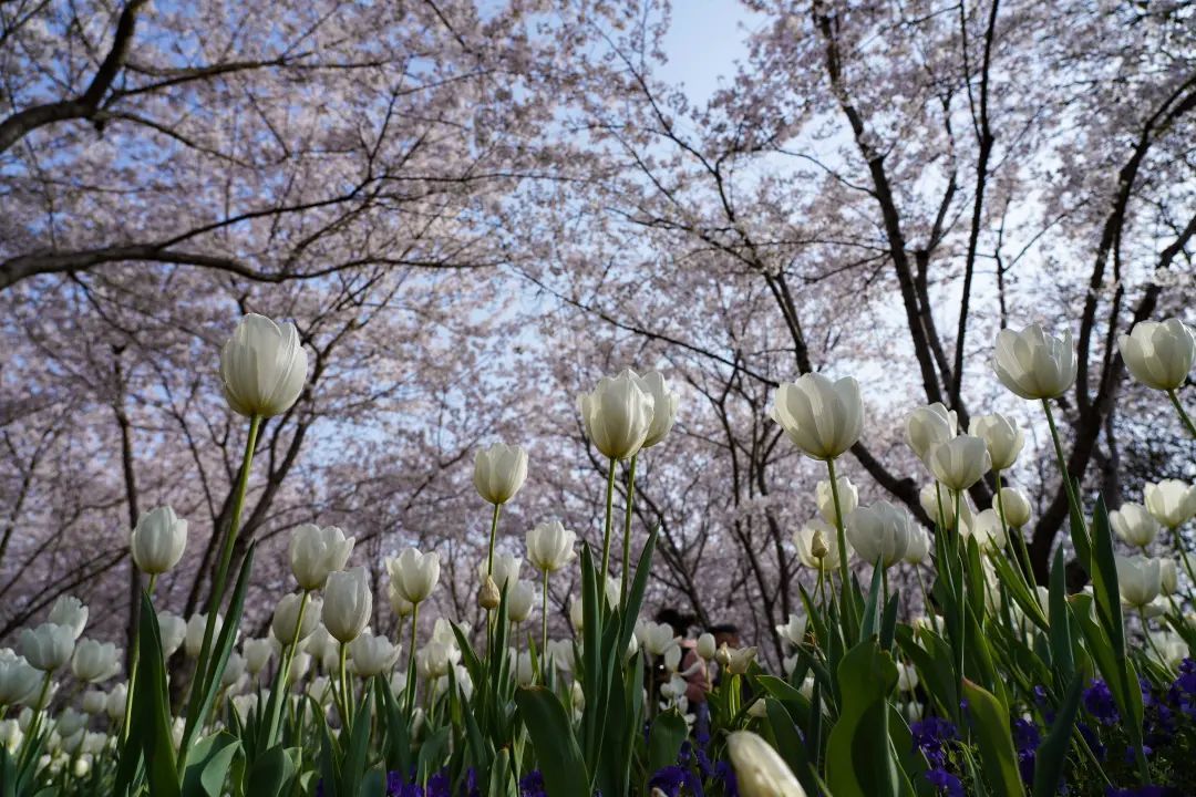 树上樱花浪漫,树下郁金香花香满园!