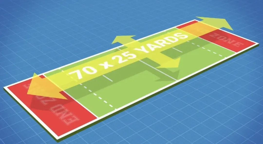 比赛通常在70码长、25码宽(约64米×23米)的场地上开展。对于人员数量的要求比较灵活,常见的以5v5,7v7居多。共分为两队,一队进攻,一队防守。