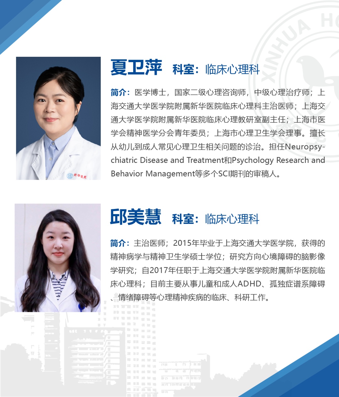 上海新华医院临床心理科/儿童青少年精神心理健康中心着眼于一生发展,重视心理健康从儿童早期开始,为各阶段人群提供心理发展、问题和精神障碍的咨询、评估、诊疗。如,焦虑、抑郁、躯体形式障碍、应激相关障碍、心境障碍、躯体疾病共患精神心理障碍;注意缺陷多动障碍(ADHD)、孤独谱系障碍、抽动障碍、学习障碍、对立违抗障碍。特色病种为从幼儿到成人ADHD的全年龄段诊疗及共患病的复杂ADHD诊疗;情绪和心理创伤相关障碍的干预和诊疗。多种诊疗方法在国内领先使用或自主研发,具有全面性和连续性。对从婴幼儿到儿童青少年的各种心理行为/障碍富有经验。