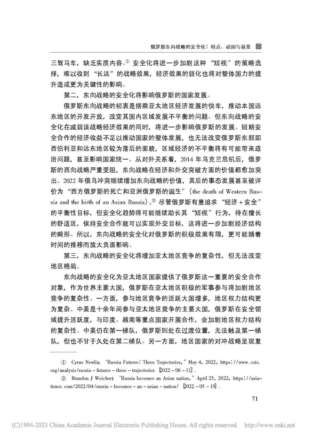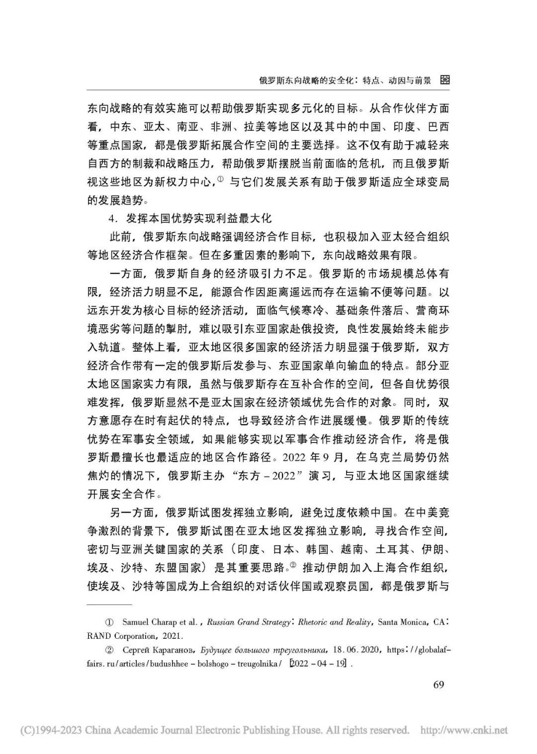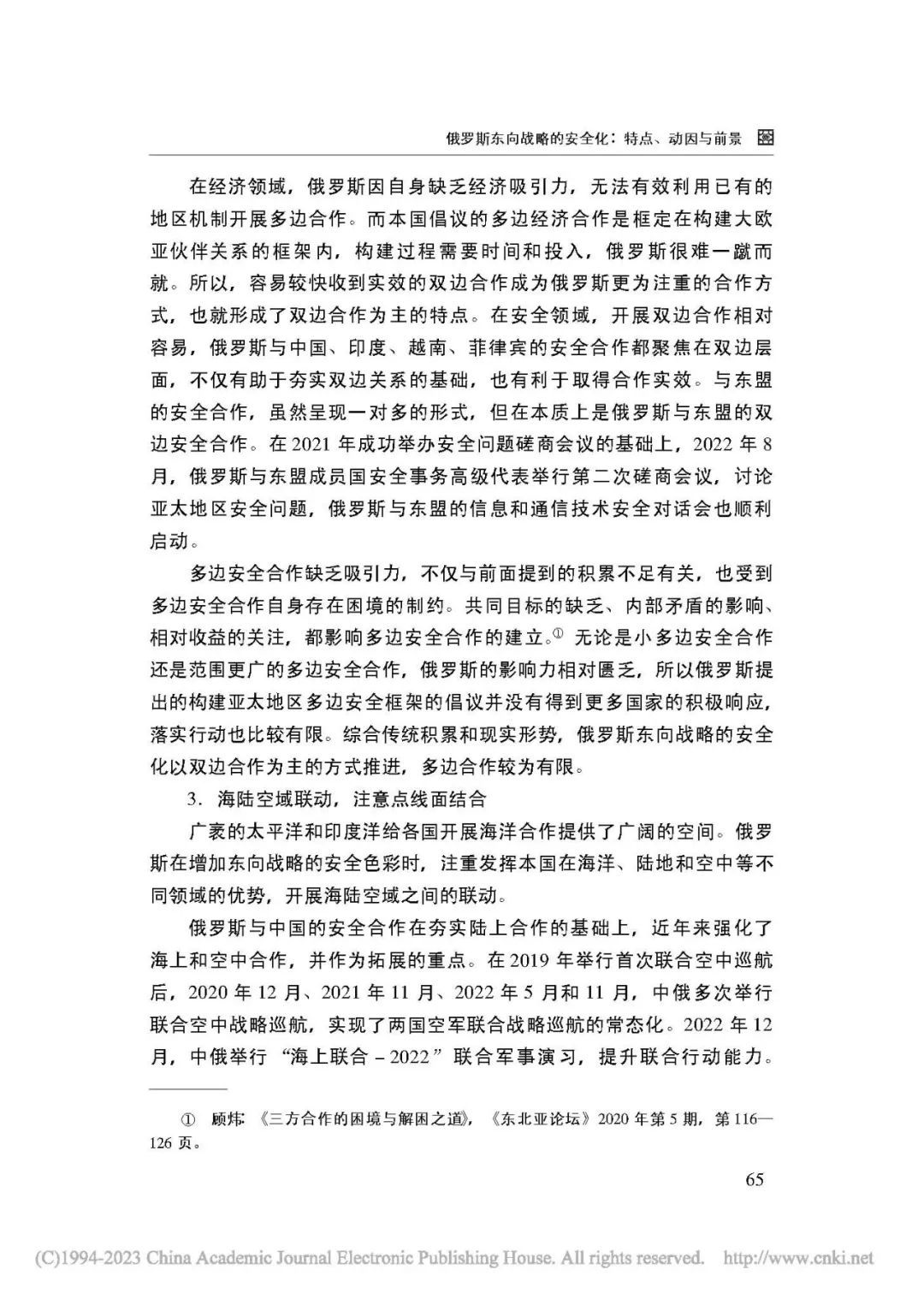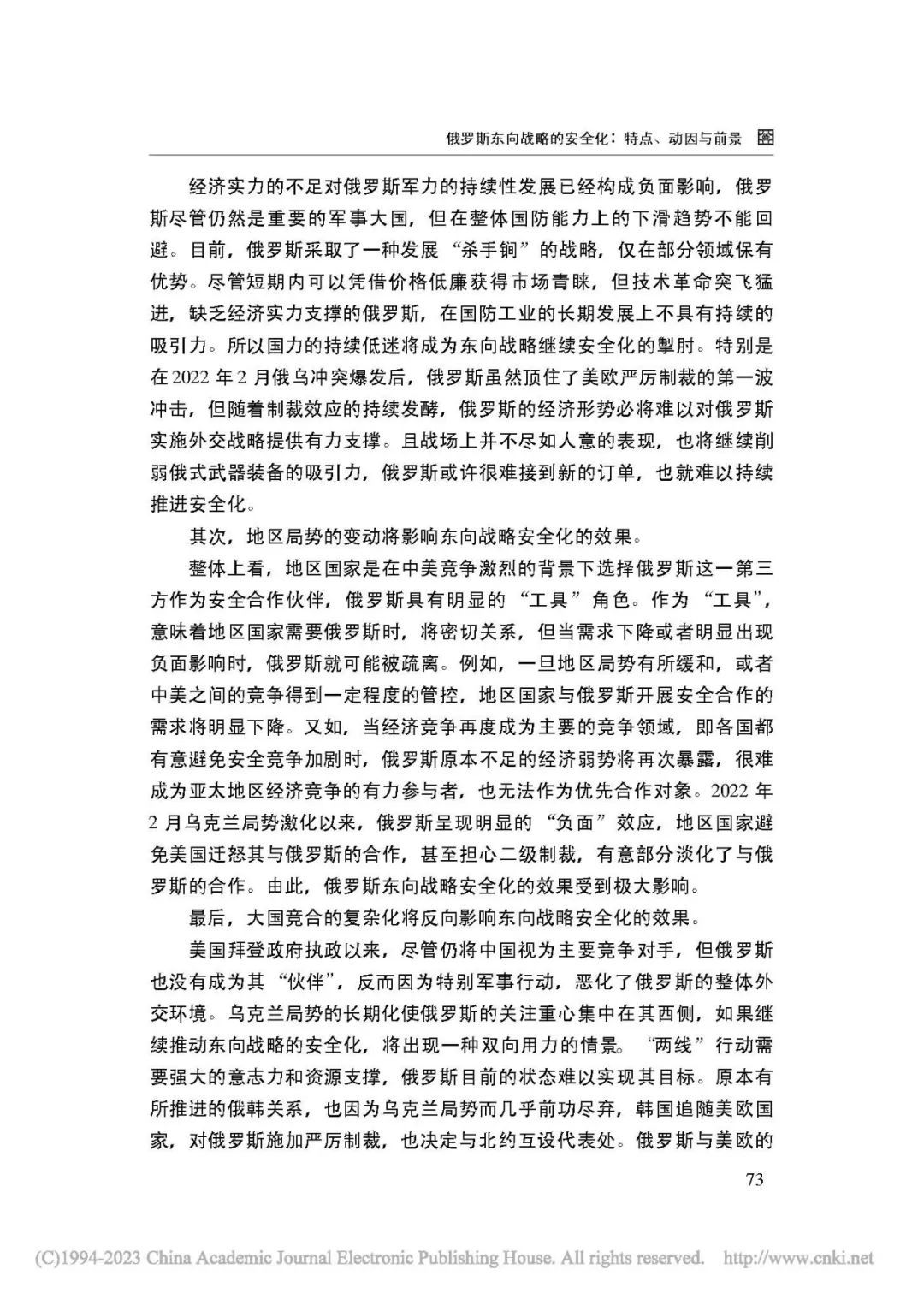 [内容摘要]俄罗斯的东向战略最初以经济合作为主要目标,意在促进本国的经济发展。但随着大国竞争的回归和亚太地区竞争的激烈化,其东向战略呈现出愈加明显的安全化趋势。俄罗斯东向战略的安全化表现为加强伙伴合作,双边方式为主,多边合作有限,注重海陆联动等特点。这一变化既顺应了大国竞争与合作的新趋势,也有利于发挥本国优势,是俄罗斯调整外交布局的重要步骤。俄罗斯东向战略的安全化将给地区和国际形势带来重要影响,具有长期化发展的可能。在乌克兰局势改变俄罗斯外部环境的背景下,俄罗斯将更加看重亚太地区,借助东向战略实现国家利益。中俄两国可以继续加强在亚太地区的战略协作。