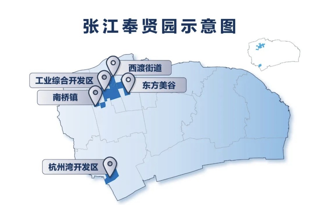 为让张江国家自主创新示范区的创新氛围带动更多地区,2012年12月张江奉贤园获市政府批准成立,目前总面积18.95平方公里,覆盖上海市工业综合开发区、东方美谷公司、上海杭州湾经济技术开发区部分区域、南桥镇部分区域、西渡街道部分区域。