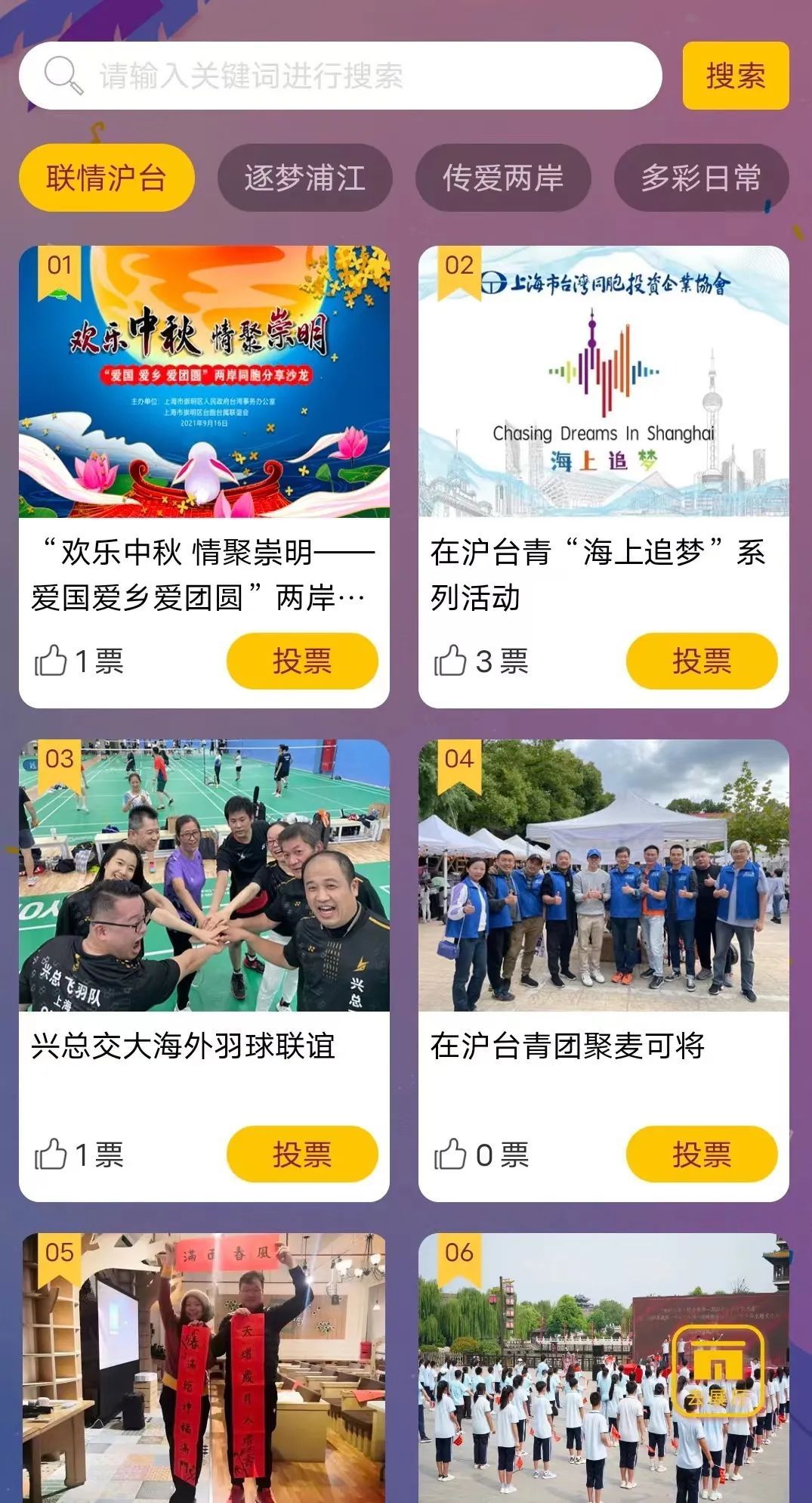 我们在线上展厅内同步开设了线上投票页面,便于大家在观展之余随时为自已喜爱的活动“点赞”“打call”。我们将依据投票结果最终产生10个“最具人气奖”和20个“优秀活动奖”,并及时在“沪台通”微信公众号公布获奖名单。
