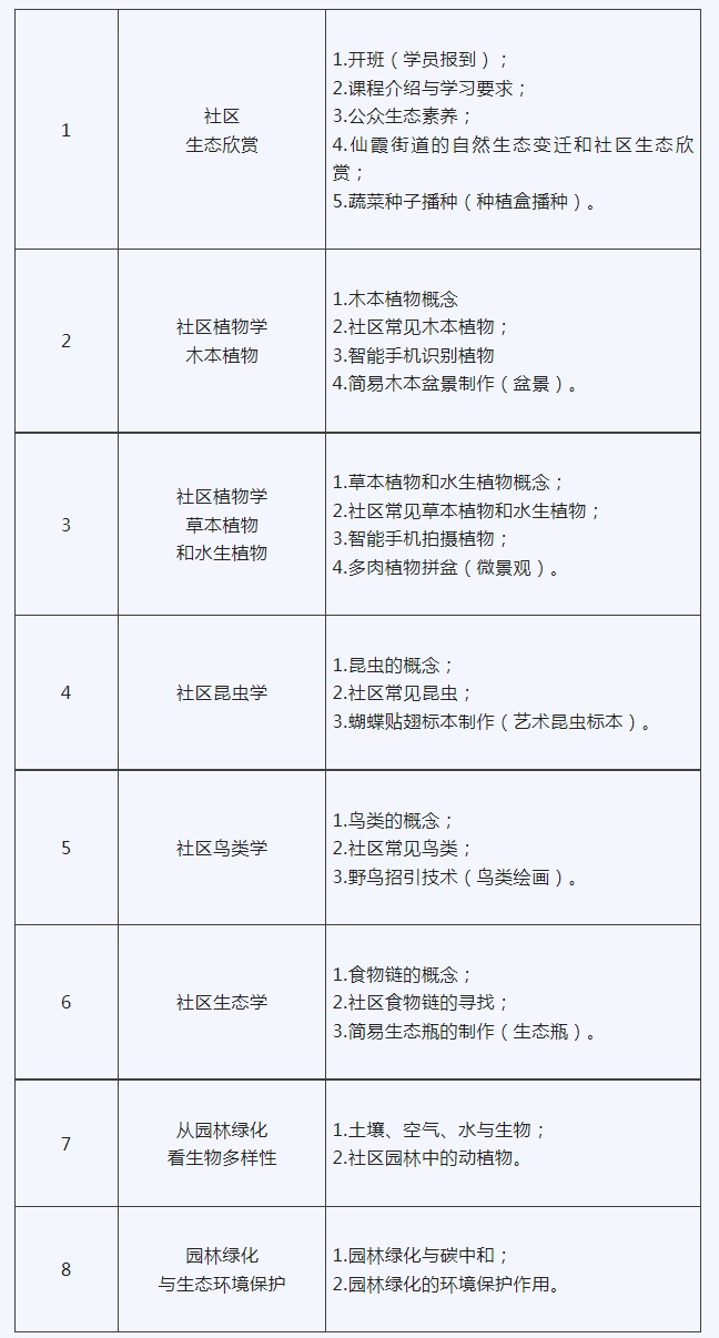 3、课程注重知识教学和技能教学的结合,传统生态知识和社区绿化的结合,强调社区生态的体验。结合课程要求,充分利用社区的生态教学资源和环境,让更多的学员得到生态效应的体验。