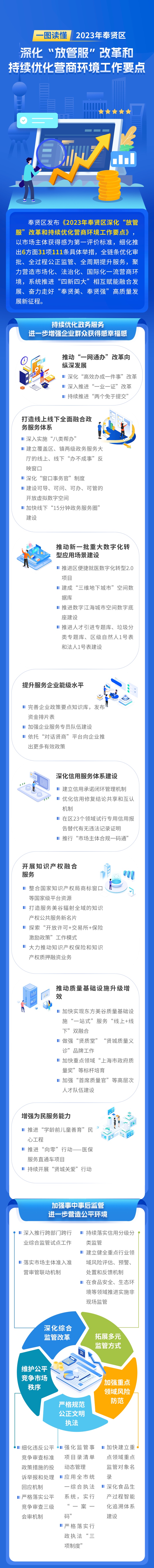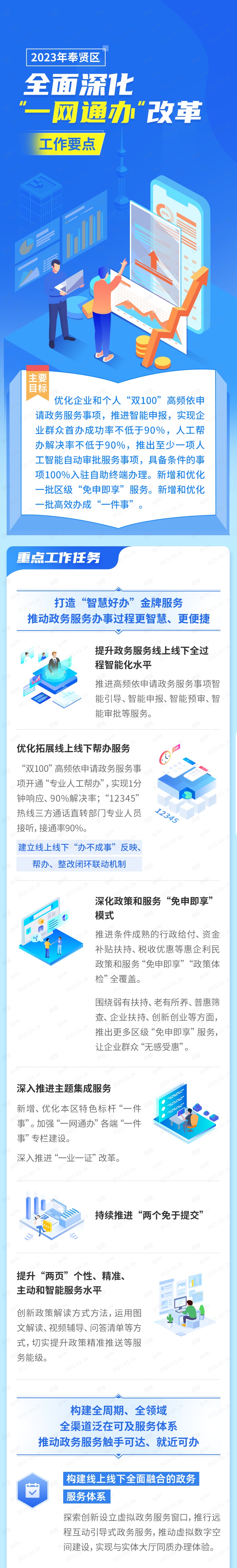 2022年奉贤区聚焦简政放权、放管结合、优化服务、“一网通办”,从市场主体和群众的实际需求出发,大胆创新、奋力攻坚,全面落实各项改革创新任务,出台了一系列创新举措和做法,形成了独具特色的奉贤经验和奉贤模式。2023年奉贤区将深入推进简政放权,加强事中事后监管,优化政务服务,支持重点区域重点领域创新发展,全面深化“放管服”改革,持续优化营商环境。强化数据和技术赋能,打造“智慧好办”金牌服务,构建泛在可及服务体系,加强“一网通办”数字化运营管理,全面深化“一网通办”改革。