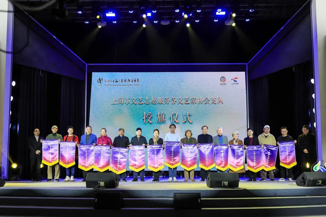 沈文忠、郭俊为上海市文联15家协会的新时代文艺志愿服务支队授旗。