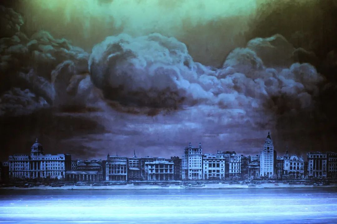 外滩,是上海的百年记忆,也是舞剧开场后第一个出场的上海印象。设计师在上空绘上厚厚的云层,渲染着雨季的暗淡色调。在大幕拉开时,建筑的图案被藏在地面,梦幻世界中男女主人公在云雾缭绕的背景前起舞,他们像飞往天际的风筝,享受着两个人的世界。而后吊杆升起,外滩影像渐渐露出,幻影隐去,眼前的世界随着掉落的雨滴从天上回到了人间。