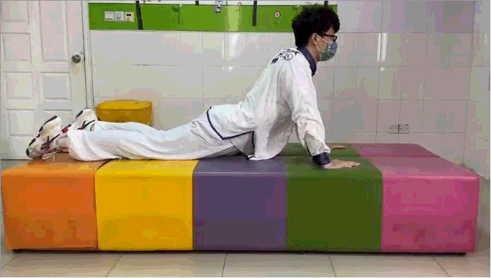 取俯卧位,双手撑起上半身到无痛的极限位置处,下半身保持不动。保持1分钟,做5次。
