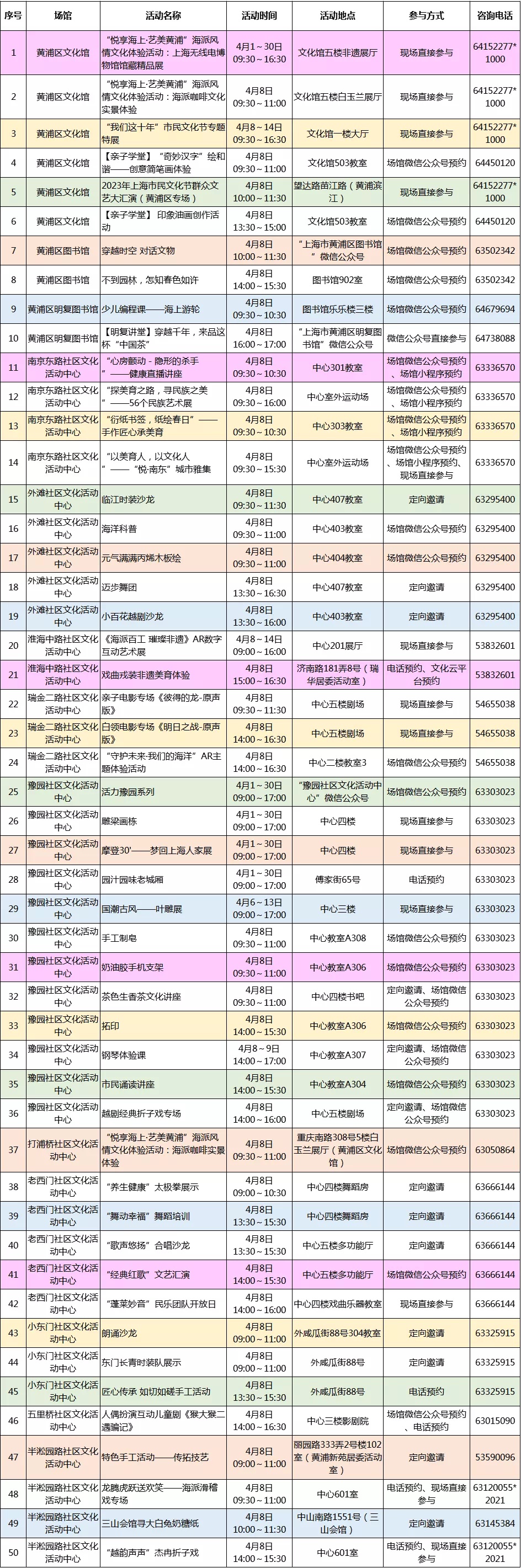 4月,黄浦区还将在区文化馆、区图书馆、明复图书馆和社区文化活动中心开展展演、展览、培训、讲座等多类别多形式的文化活动,进一步提升市民群众文化获得感和幸福感。