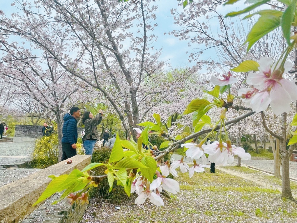 据了解,园内除了樱花,还有垂丝海棠、油菜花、山茶花等各色春花同步开放,花期持续至4月。园方特推出100元/人(原价140元/人)的樱花季套票,游客除了可以参观园内考古遗址展示馆和文化展示馆,还可以乘着古色古香的画舫游船泛舟湖上。
