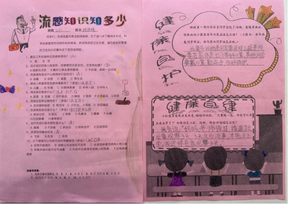 三年级以“流感知识知多少”为主题,开展了预防流感安全教育活动。通过班主任宣讲流感知识、班级流感知识大竞赛等活动,教育学生如何正确地预防和处理流感病情;通过组织家庭“亲子情境辨析”活动,让每个家长清晰健康诚信和健康自护的意义,让家长了解学校防疫防控规则,实现家校同频共振。